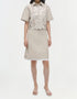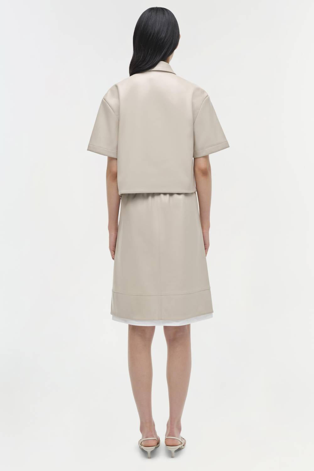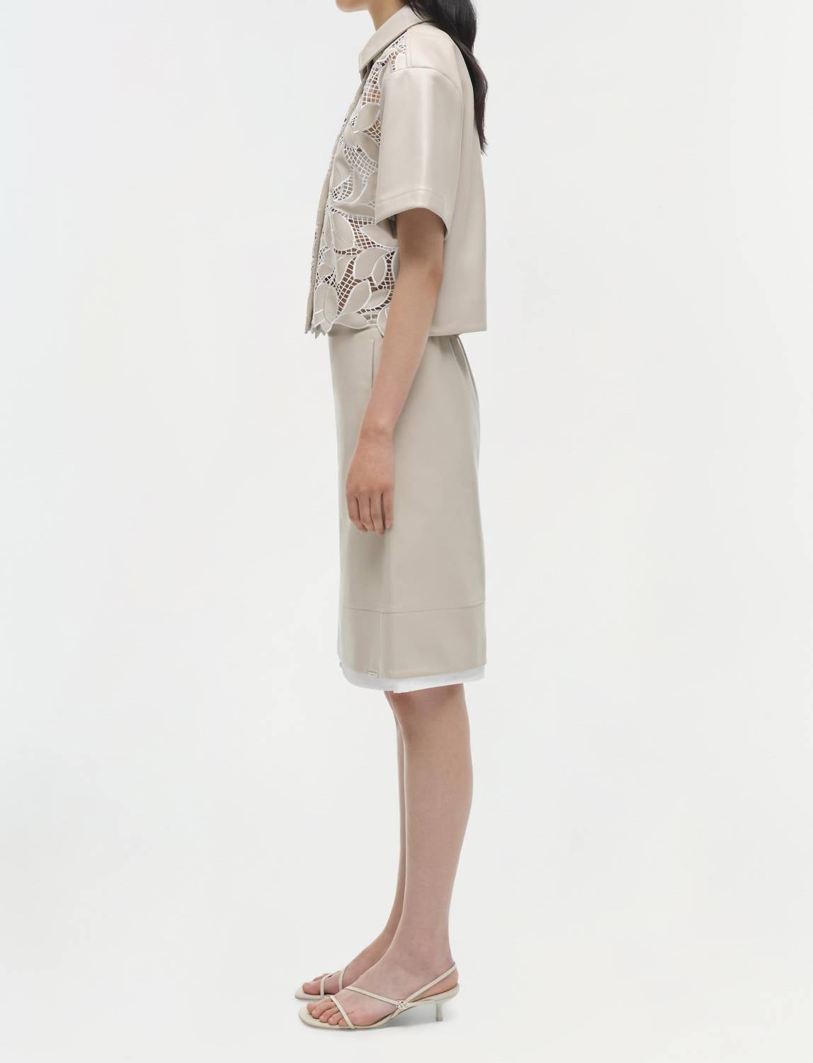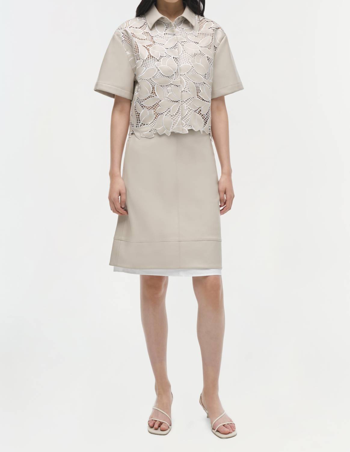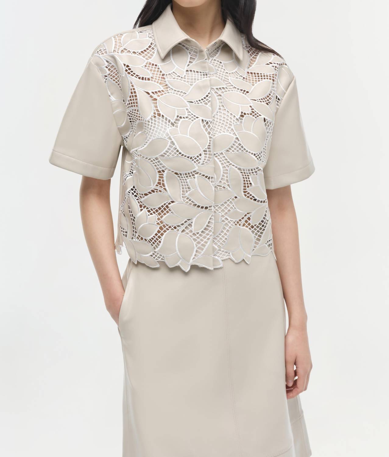 Discover the Robinson Camp Shirt by Jonathan Simkhai, a distinctive piece in Sand Multi that showcases vegan leather abstract floral embroidery for a modern boho chic look. This short sleeve blouse is composed of 100% Polyurethane and features a stylish collar and partly lined interior. Snap closure. Dry clean only. Model is 5'10" and is wearing a size small.