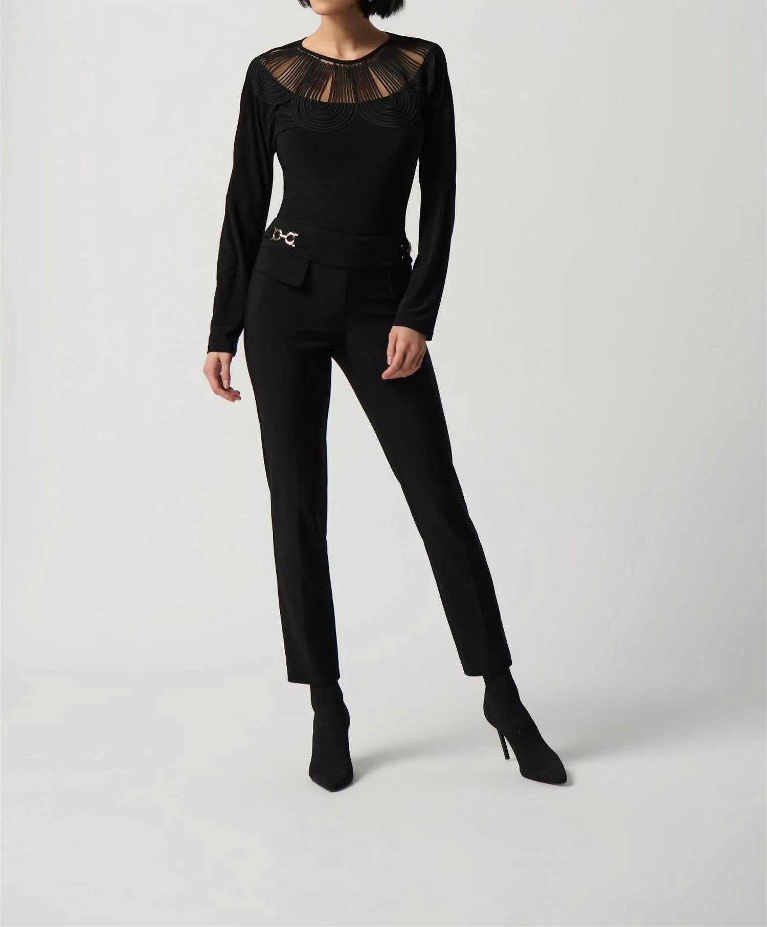 Abrace a elegância sem esforço com a Blusa Preta com Decote Detalhado Joseph Ribkoff, criada para mulheres que buscam versatilidade e estilo deslumbrante. Esta blusa de manga comprida é confeccionada em 96% poliéster e 4% elastano, proporcionando um caimento confortável e um sofisticado detalhe no pescoço. Esta blusa mede aproximadamente 66 cm de comprimento (tamanho 12) e é confeccionada com maestria no Canadá. Com fecho pull-on, é fácil de combinar em qualquer ocasião e os cuidados são simples, com instruções de lavagem à mão. A modelo tem 1,75 m de altura e veste tamanho 36.