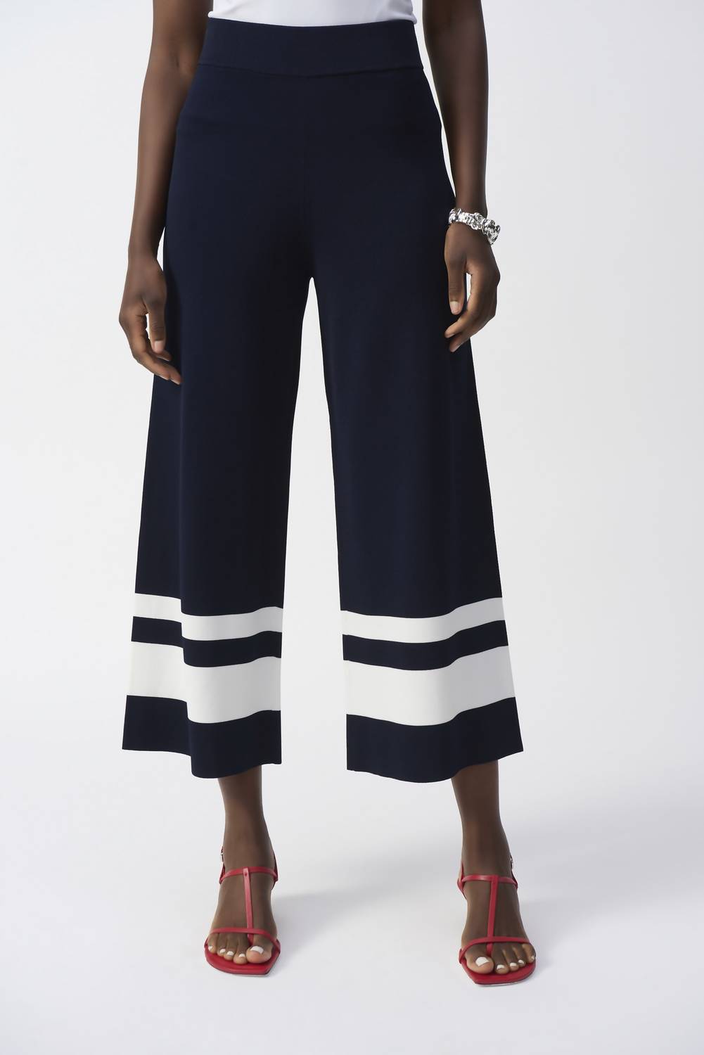 Eleve seu guarda-roupa de outono com a Calça Culotte de Malha Placement Stripe Sweater da Joseph Ribkoff em Azul-Noite/Baunilha. Estas calças compridas e largas apresentam um sofisticado padrão listrado, oferecendo um caimento relaxado e elegante de cós alto. Feitas com uma mistura de 80% rayon de viscose e 20% nylon, elas vêm com cós elástico para maior conforto. Com uma costura interna aproximada de 71 cm e instruções de cuidado fáceis de lavar à mão e secar na horizontal, estas calças são uma escolha elegante e prática para qualquer reunião de Ação de Graças.