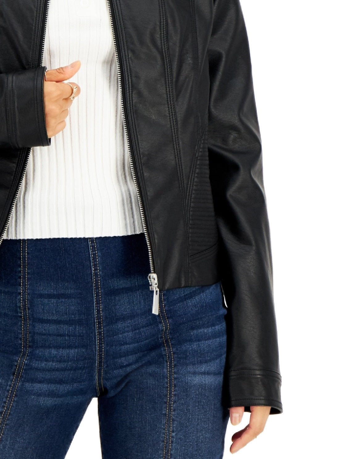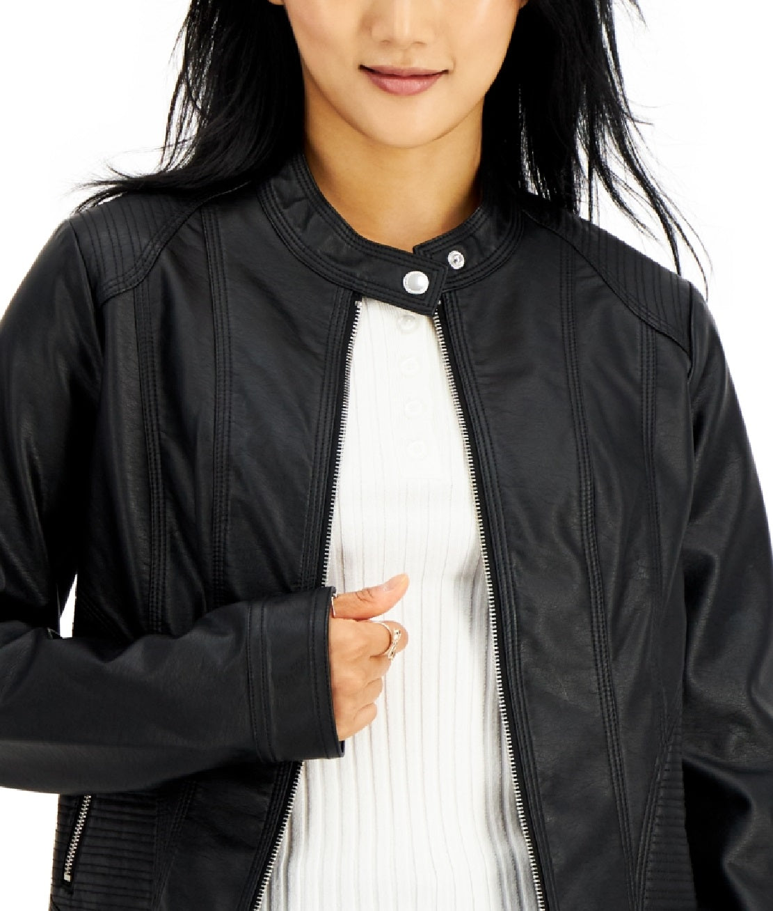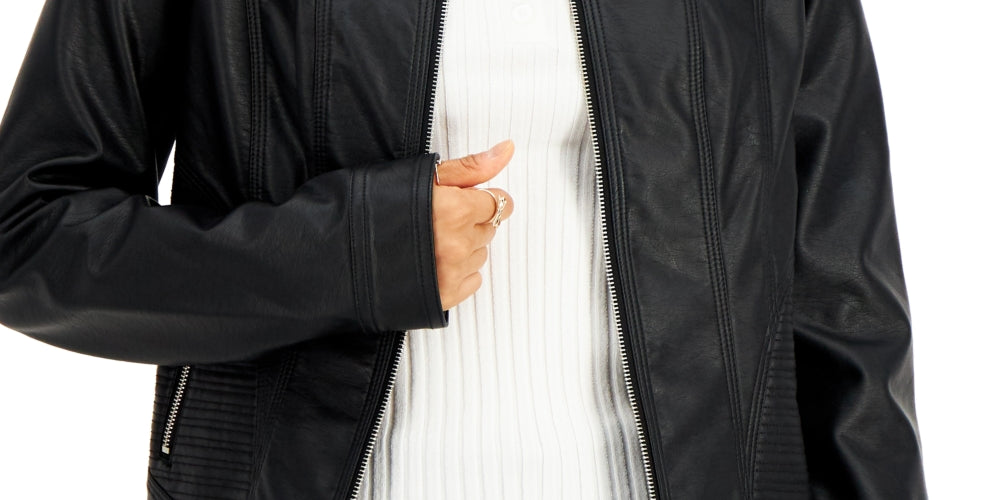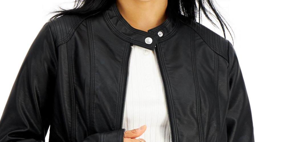 Jou Jou liberta a motociclista que existe em você com este casaco inspirado em motos, feito inteiramente em couro sintético elegante. | Aproximadamente 51 cm de comprimento, do centro das costas até a bainha | Gola canelada; fecho frontal com zíper | Dois bolsos com zíper na frente | Forrado | Exterior; poliuretano; forro; poliéster | Limpeza somente localizada