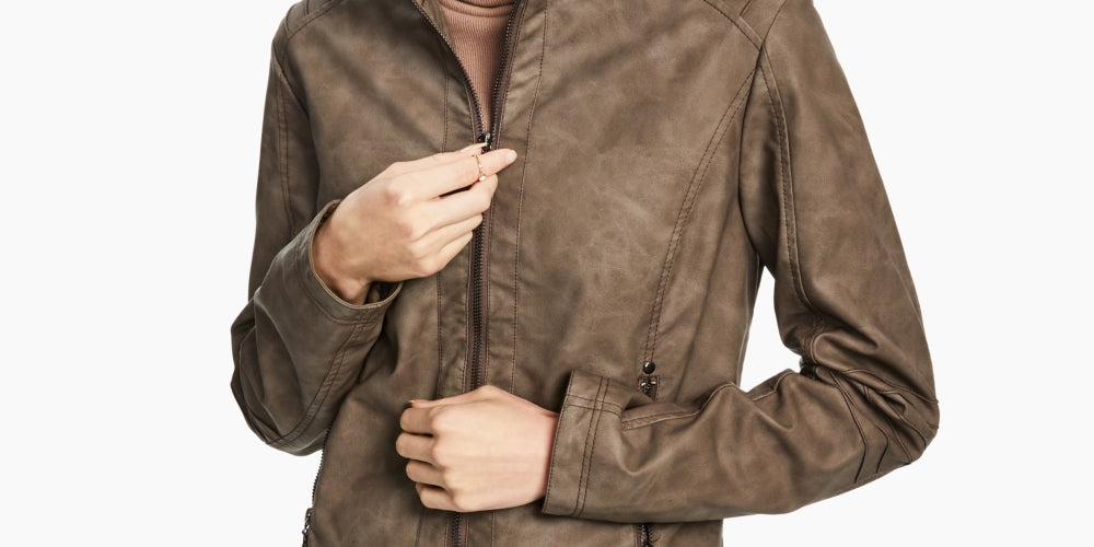 Deixe a motoqueira que há em você brilhar com esta linda jaqueta de couro sintético da Jou Jou | projetada com dois bolsos com zíper e uma pequena gola alta. | Aproximadamente 21 de comprimento do centro das costas até a bainha | Gola alta; fecho de zíper frontal | Dois bolsos com zíper nas laterais | Forrado | Exterior; poliuretano; forro; poliéster