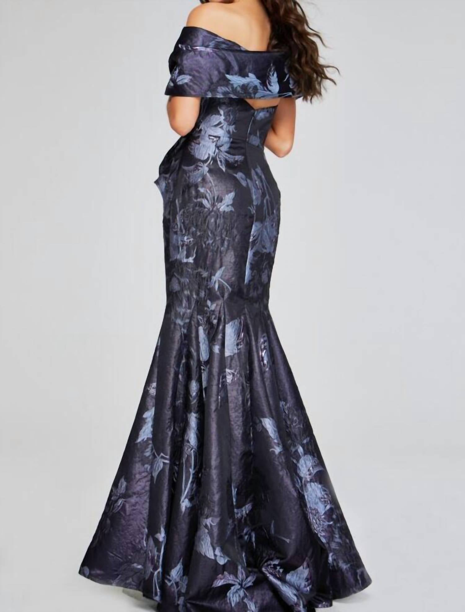 Perfect for prom or any formal event. Strapless, mermaid silhouette dress in a grey multi floral pattern is crafted to enhance your femininity, with a sweetheart neckline that beautifully highlights your neck and shoulders. Featuring a luxurious metallic fabric, the floor-length gown is adorned with intricate pleats and rosettes, adding to its structured, boho chic appeal. Closure is secured with a zipper. Requires dry cleaning to maintain its exquisite charm.