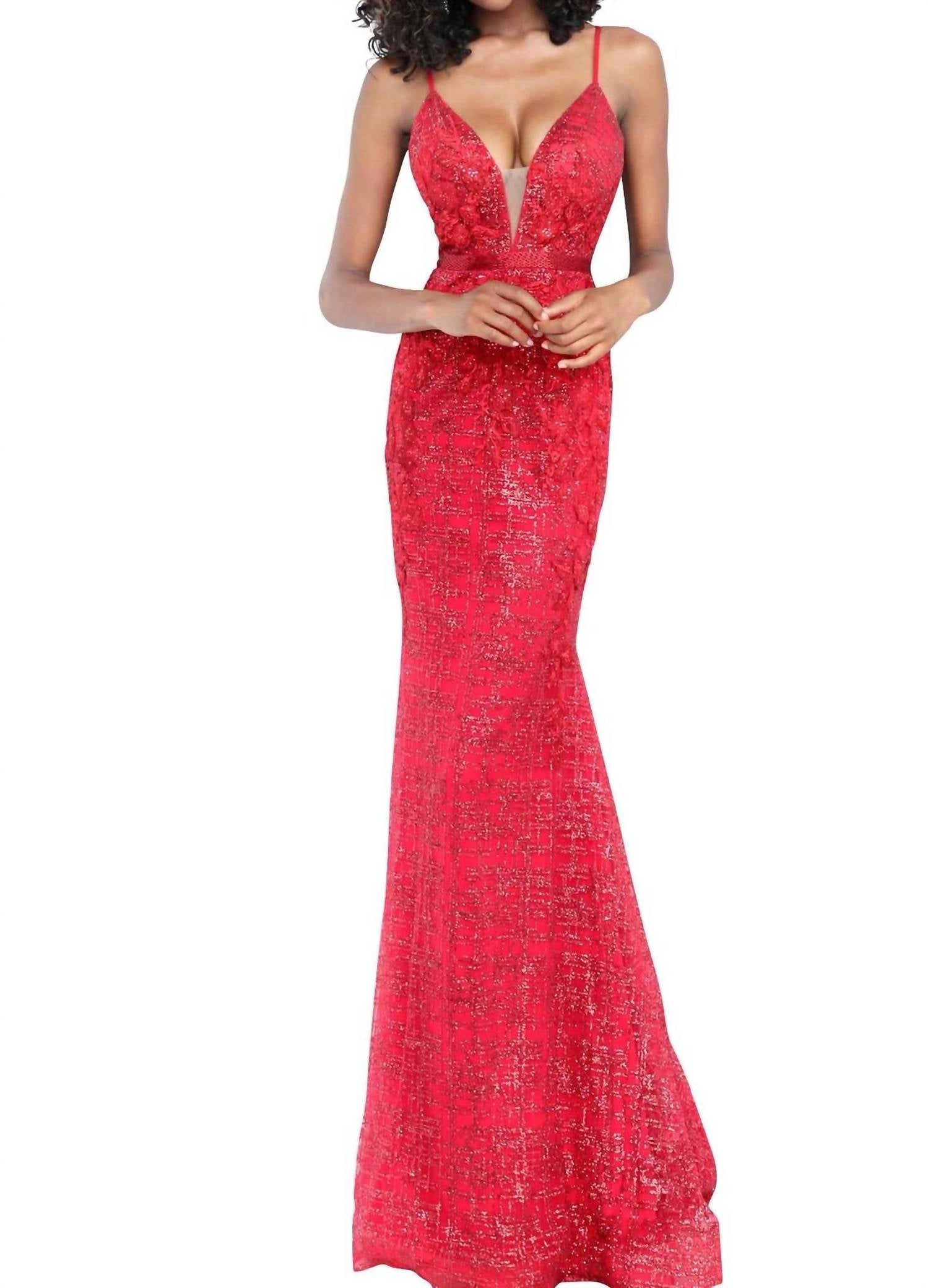 Procurando o vestido de festa perfeito? Não procure mais... Apresentamos o Vestido com Apliques Florais Bordados da JOVANI, um vestido vermelho requintado perfeito para bailes de formatura ou celebrações de Natal. Este vestido longo apresenta delicadas alças finas e um romântico decote em V, acentuado por um corpete de renda intrincadamente bordado com aplicações florais. O padrão texturizado e a silhueta trompete valorizam graciosamente o seu corpo. Fechamento por zíper. Lavagem a seco somente.