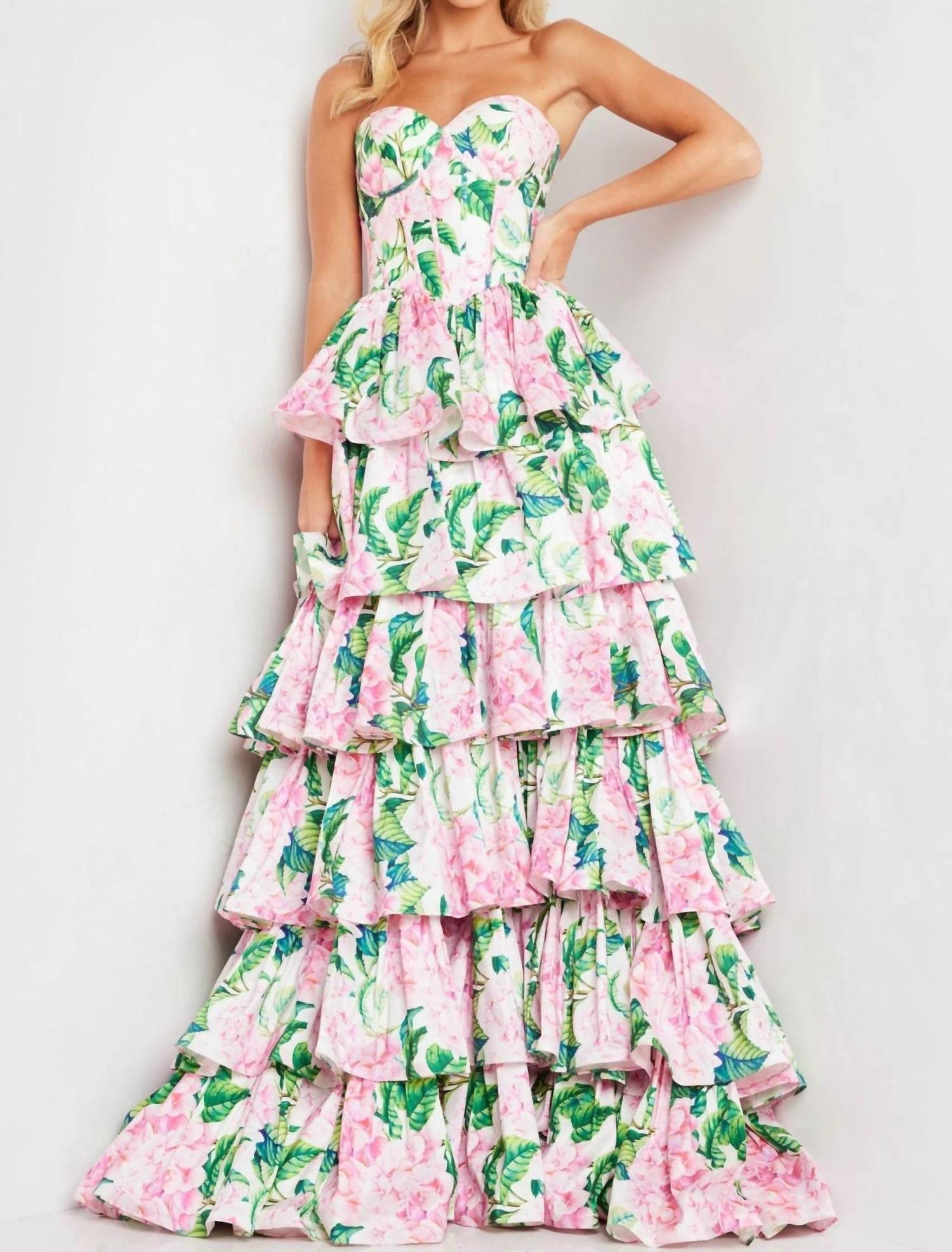 O vestido Fiona da JOVANI é uma criação deslumbrante sem alças que exala elegância e sofisticação, perfeita para qualquer baile de formatura ou evento formal. Confeccionado em cetim estampado luxuoso, este vestido de festa floral apresenta uma saia longa em camadas, realçando sua silhueta romântica com um decote coração. O vestido garante um ajuste seguro com fecho de zíper nas costas e é confeccionado sem bolsos para uma elegância elegante. O cuidado é simples, com lavagem a seco localizada recomendada, garantindo que este vestido permaneça uma peça essencial e atemporal em seu guarda-roupa. Disponível nos tamanhos 2 e 6.