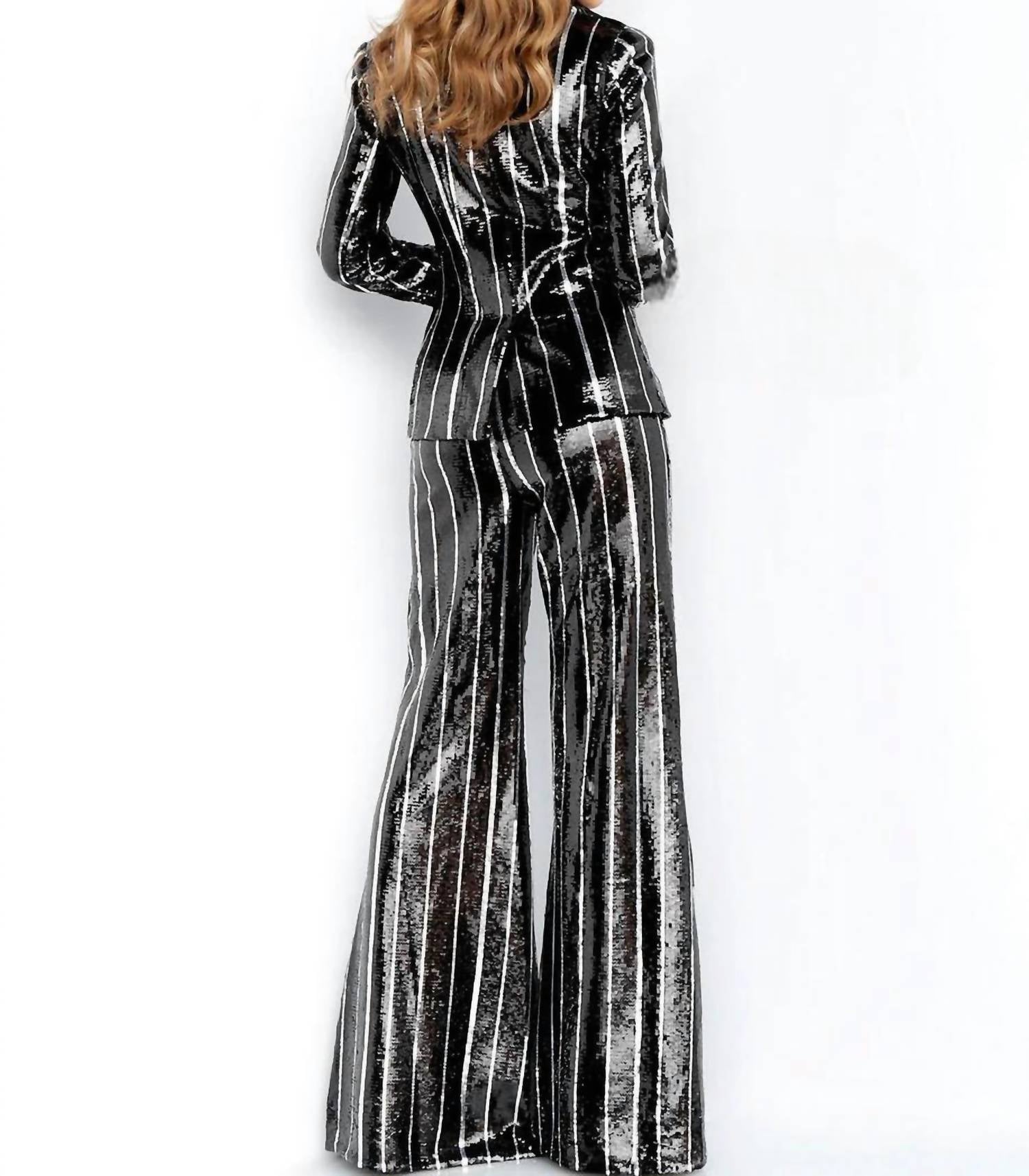 Uma versão elevada do seu blazer clássico favorito. Entre na elegância com o terno de festa com calça e blazer de lantejoulas Flare Leg da JOVANI, criado para ocasiões sofisticadas. Este terno marcante apresenta um blazer ajustado com decote em V profundo e mangas compridas finas, enquanto as calças compridas têm um caimento elegantemente evasê. Confeccionado em lantejoulas vibrantes listradas em preto e prata, o conjunto possui um elegante fecho de botão. Para melhor conservação, lave este conjunto a seco.