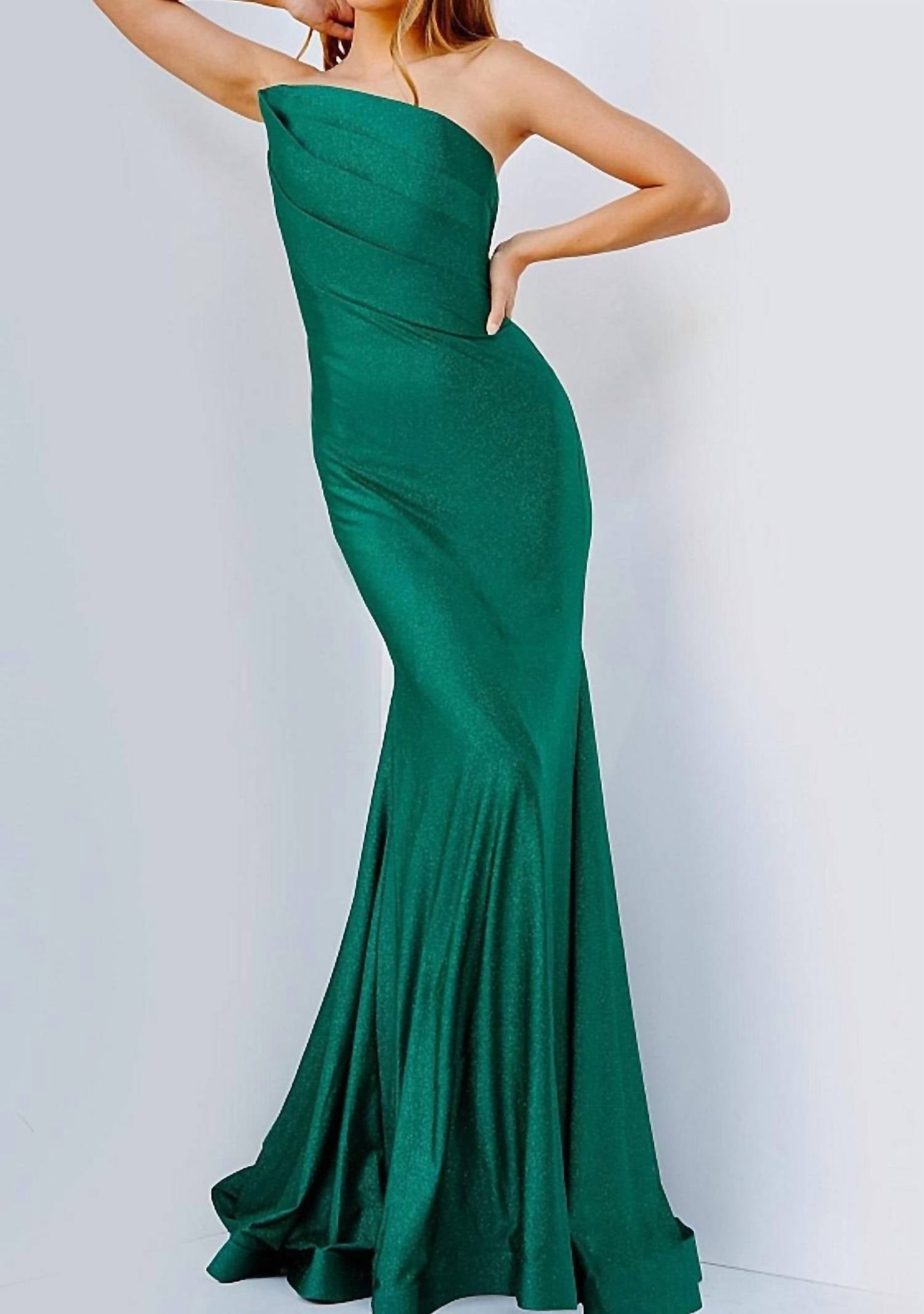 Turn heads in the cutest and most flattering evening dress. The One-shoulder Draped Glitter Gown by JOVANI is an elegant choice for any formal occasion. Its strapless design with an off-the-shoulder neckline and mermaid silhouette beautifully enhances the figure. The textured, monochrome emerald color adds a touch of glamour, secured by a practical zip closure. Care instructions: Dry clean only.