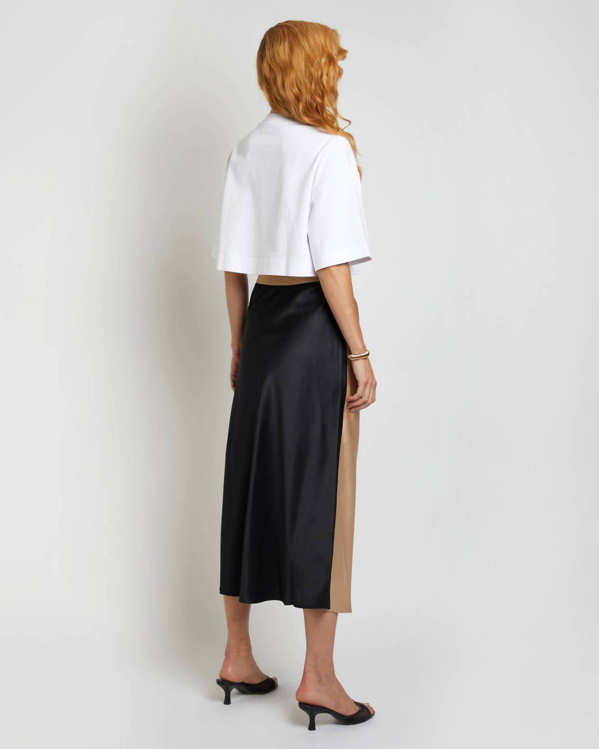Versatile piece designed for the multirole woman. Crafted from 100% silk. Midi-length skirt offers a luxurious drape and features an elasticated waist for an easy slip-on design. Reversible design expands styling possibilities. Effortlessly transitioning from sand to black. Embroidered with a distinctive JR logo at the waist. Embodies opulence and modernity, making it an essential addition to any wardrobe.