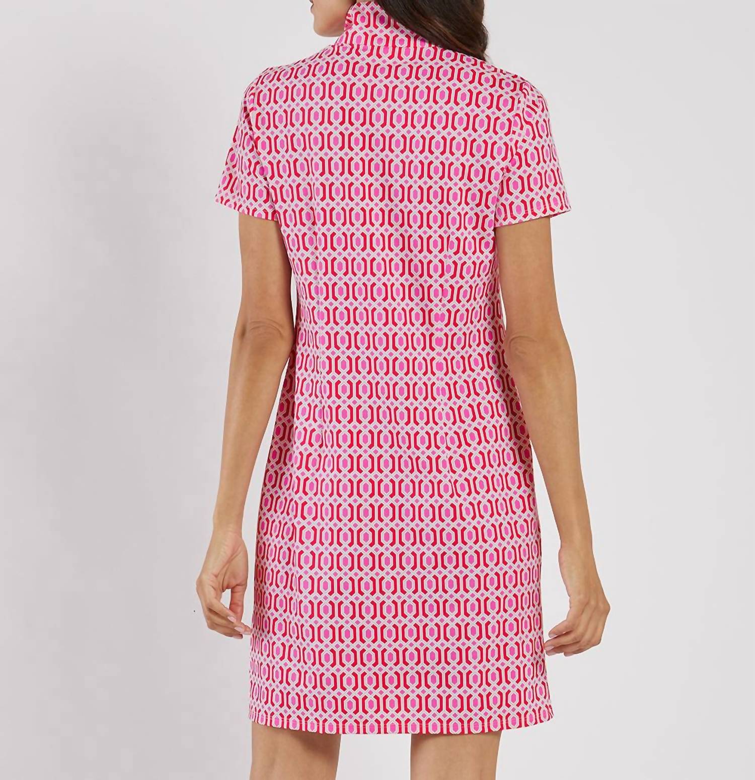 Introducing the Alexia Short Sleeve Mini Dress by Jude Connally, a chic addition to your wardrobe with its figure-flattering design. Crafted from the brand's signature Jude Cloth fabric, this dress offers a geometric pattern in Terrace Geo Peony Pink, exuding minimalist style. With a comfortable slim fit, it features a short sleeve and a sporty quarter zip closure, measuring 35 1/2" from the top of the center back in size small. Made in the USA, this shift silhouette dress is easy to care for; simply machine wash and line dry.