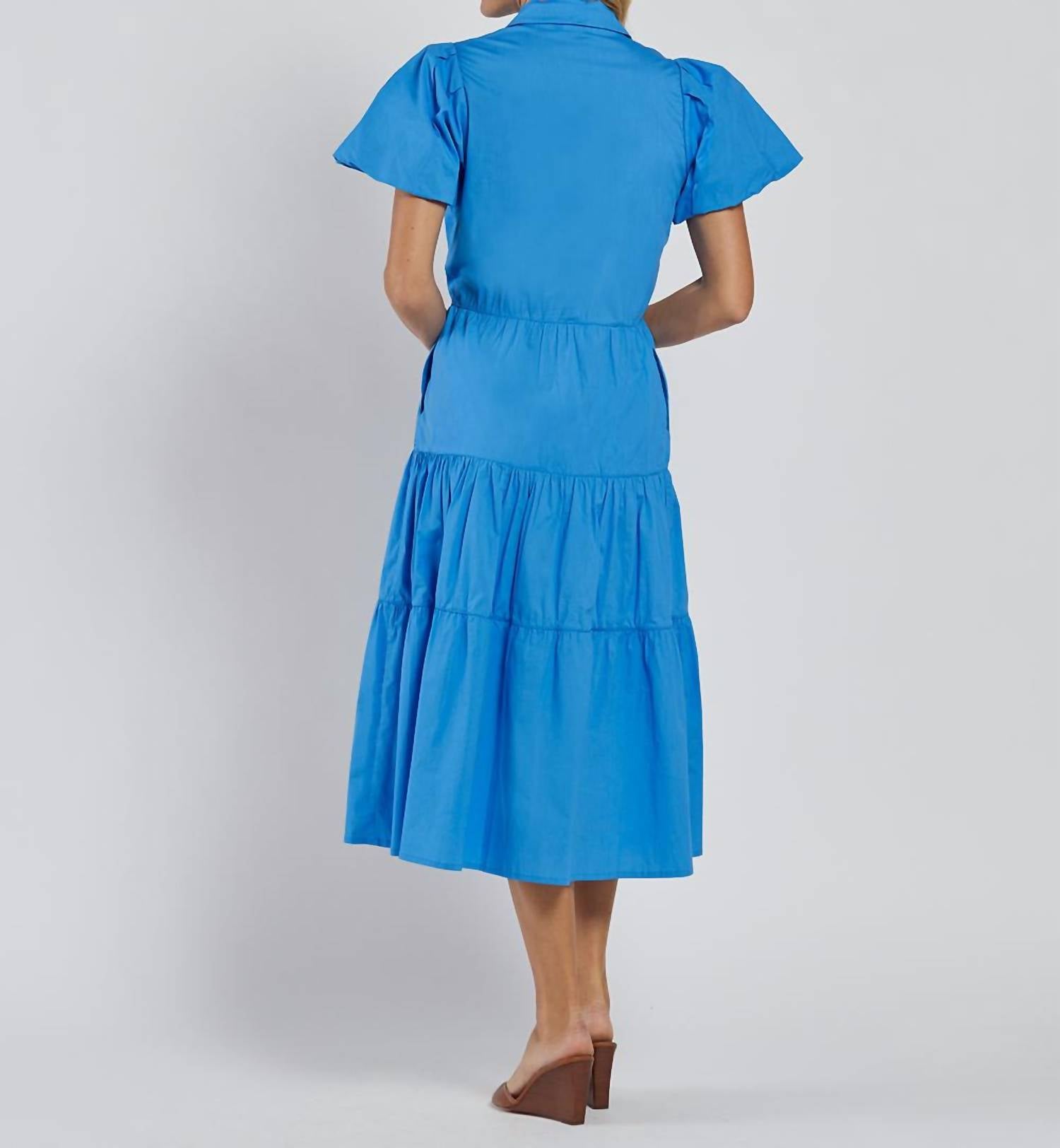 Introducing the Betsy Button-down Midi Dress by JUDE CONNALLY, a stylish addition to any wardrobe that exudes feminine elegance. This cornflower blue shift dress features short sleeves, a tiered silhouette, and a flattering V-neckline, crafted from stretch poplin for a comfortable fit. Made in India, its 46 3/4" midi length offers versatility for various occasions, complete with white shell button details. Closure: Button closure. Care: Machine wash, cool iron if necessary, do not tumble dry or use bleach.