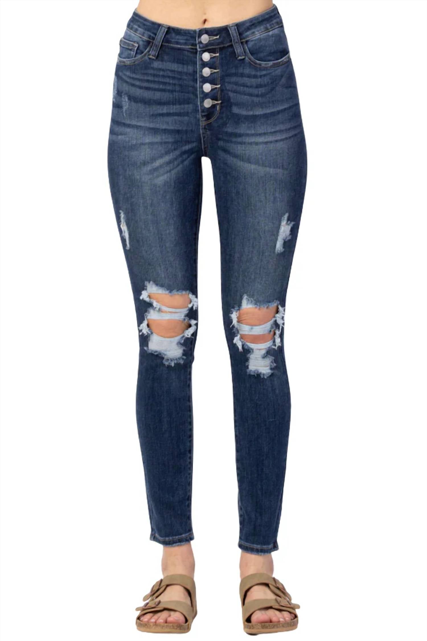 Uma calça jeans skinny que é estilosa e confortável. Adoramos esse modelo porque combina com botas, ou sem! A Calça Jeans Skinny Button Fly apresenta um acabamento clássico em jeans escuro, com um design estiloso de cinco bolsos e uma braguilha prática com botões. Com detalhes modernos em destroyed, esta calça jeans skinny oferece uma silhueta ajustada que valoriza o visual. Confeccionada em uma mistura confortável de 66% algodão, 21% poliéster, 11% rayon e 2% elastano, ela oferece elasticidade e durabilidade. No tamanho 16W, a costura interna mede 72 cm e o cós é de 29 cm, garantindo um caimento perfeito. As instruções de cuidado recomendam lavar na máquina em água fria.
