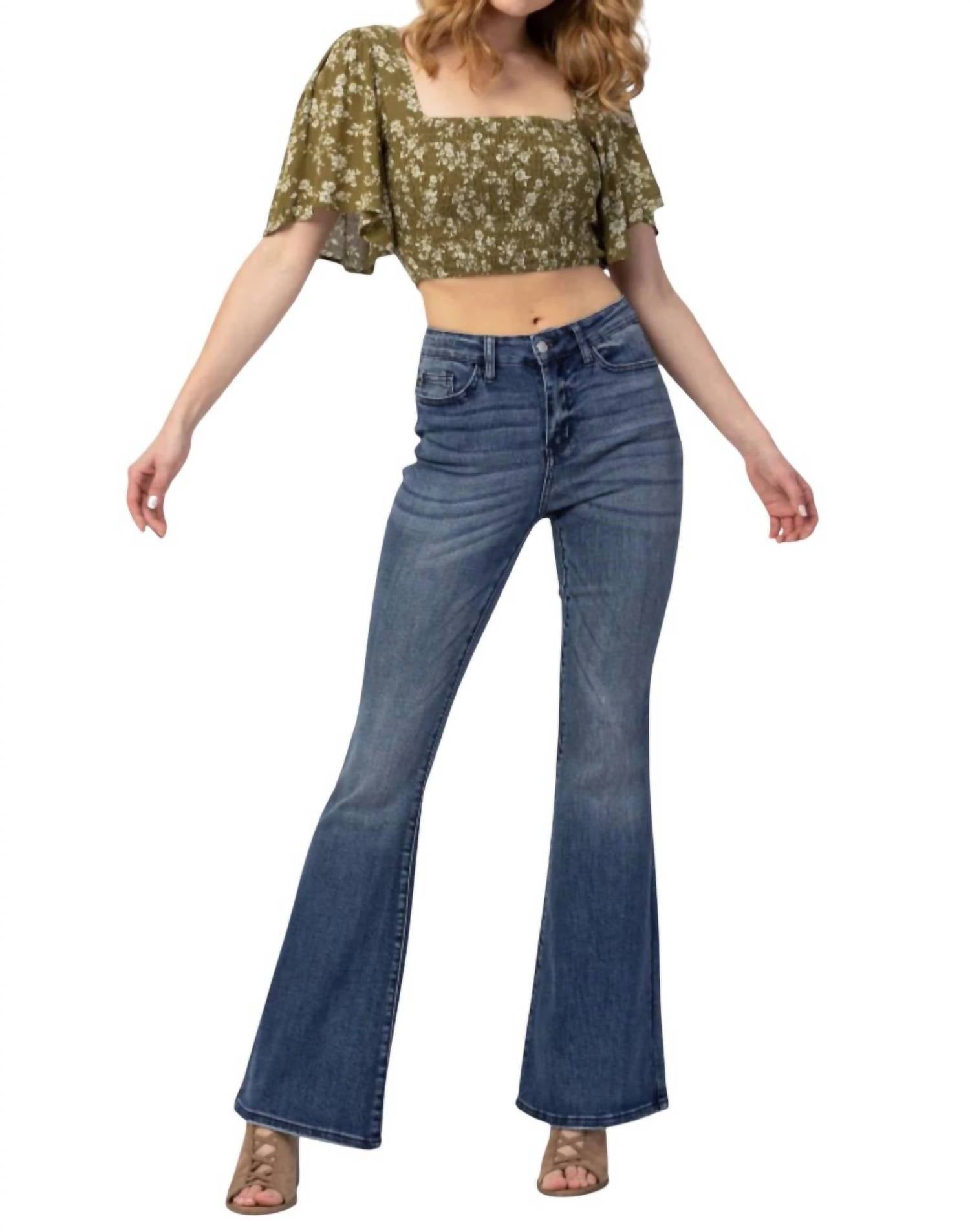Esta calça jeans apresenta modelagem flare de cintura alta, bolsos e braguilha com zíper. Confeccionada em 66% algodão, 21% poliéster e 2% elastano. O cós tem 26 cm e a costura interna tem 84 cm. Lavar somente à mão. Importado.