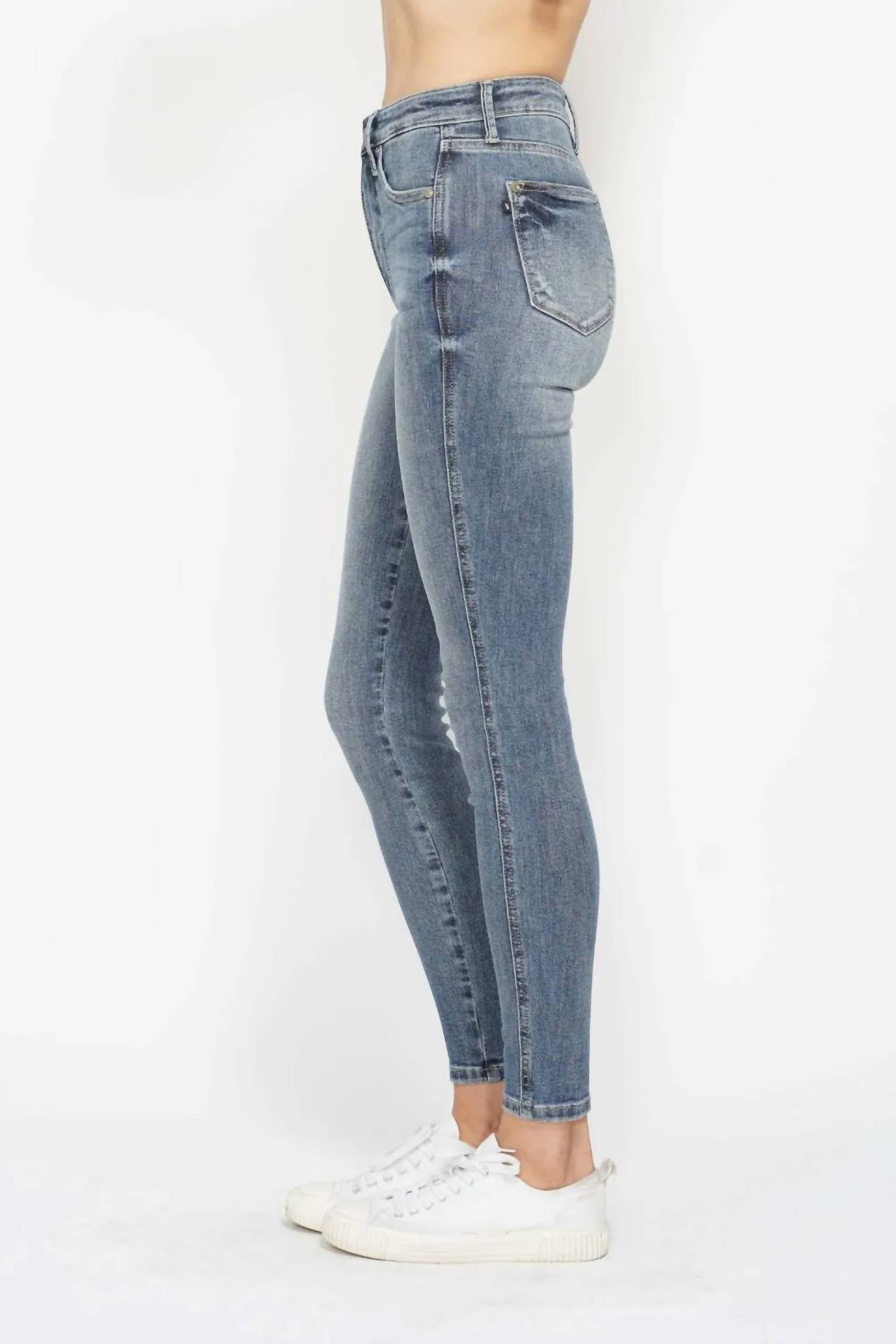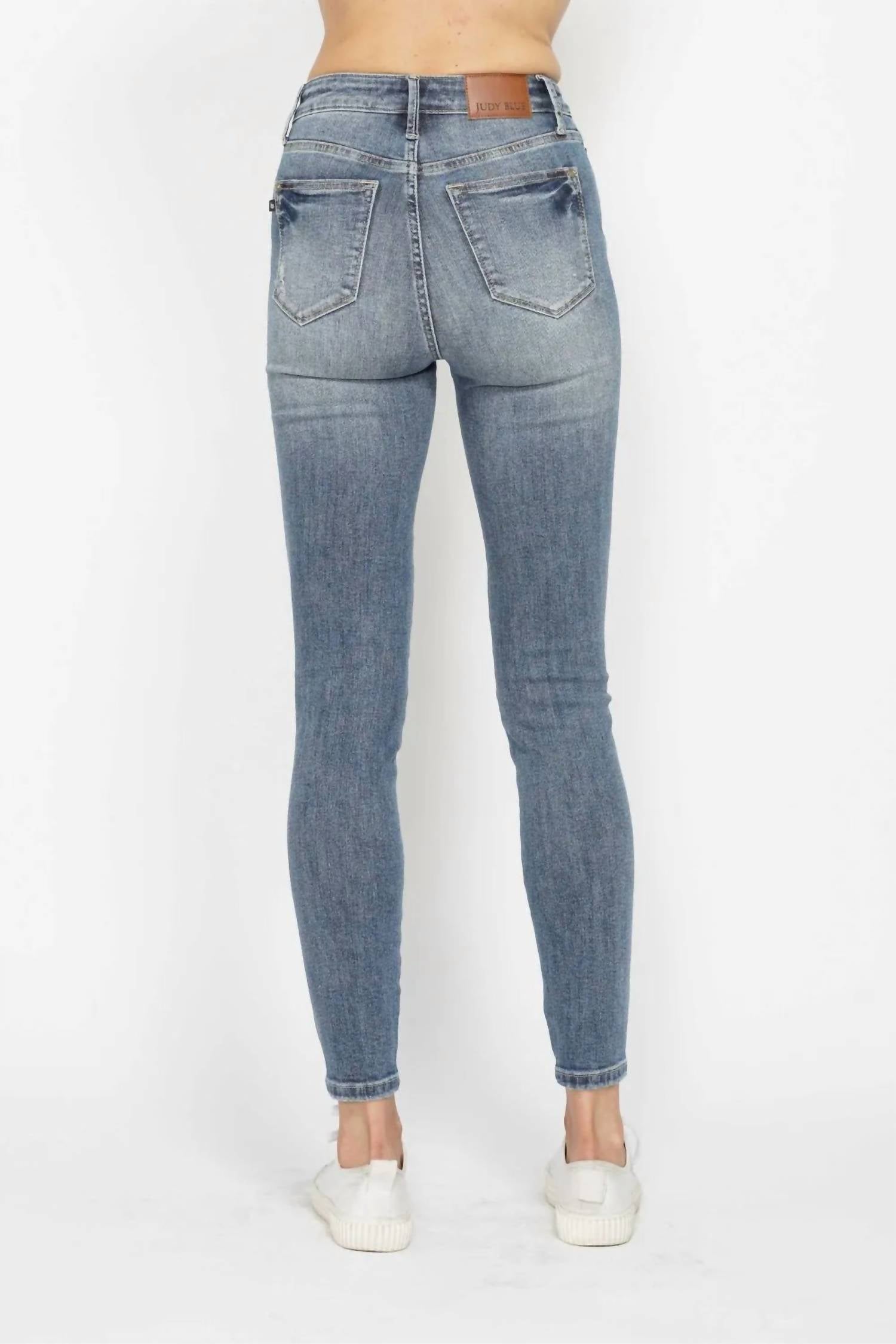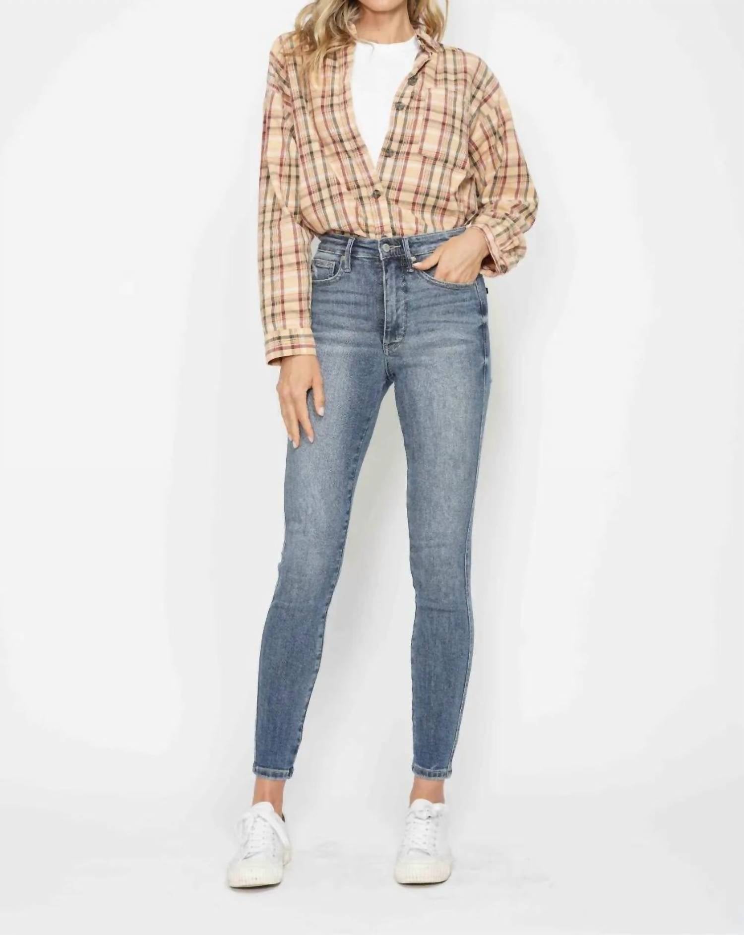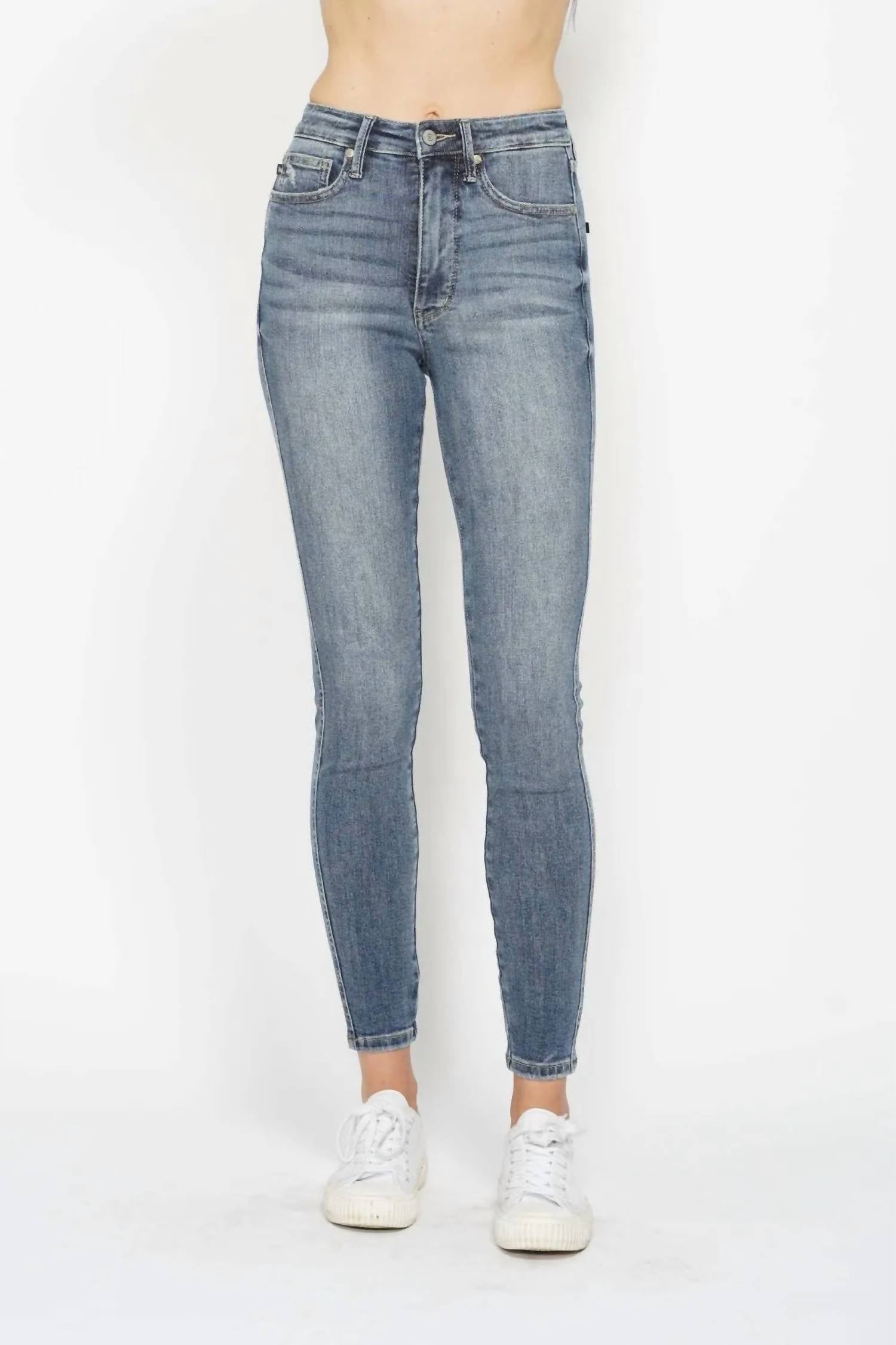 A calça jeans skinny perfeita para usar com suas botas favoritas nesta estação! Eleve seu guarda-roupa com a Calça Jeans Skinny com Controle de Barriga e Lavagem Contrastada, tamanho normal, da Judy Blue, com costura interna de 73 cm e cós alto de 25 cm para um caimento perfeito. Esta calça jeans skinny azul média é confeccionada em uma confortável mistura de algodão com 91% algodão, 7% poliéster e 2% elastano, oferecendo elasticidade moderada para facilitar os movimentos. Com um elegante fecho de botão, lavagem contrastante e painel de controle de barriga, ela valoriza sua silhueta, mantendo um visual elegante e moderno. Para maior versatilidade, esta calça jeans importada vem com bolsos e é fácil de cuidar — basta lavar na máquina com água fria e secar em temperatura baixa.