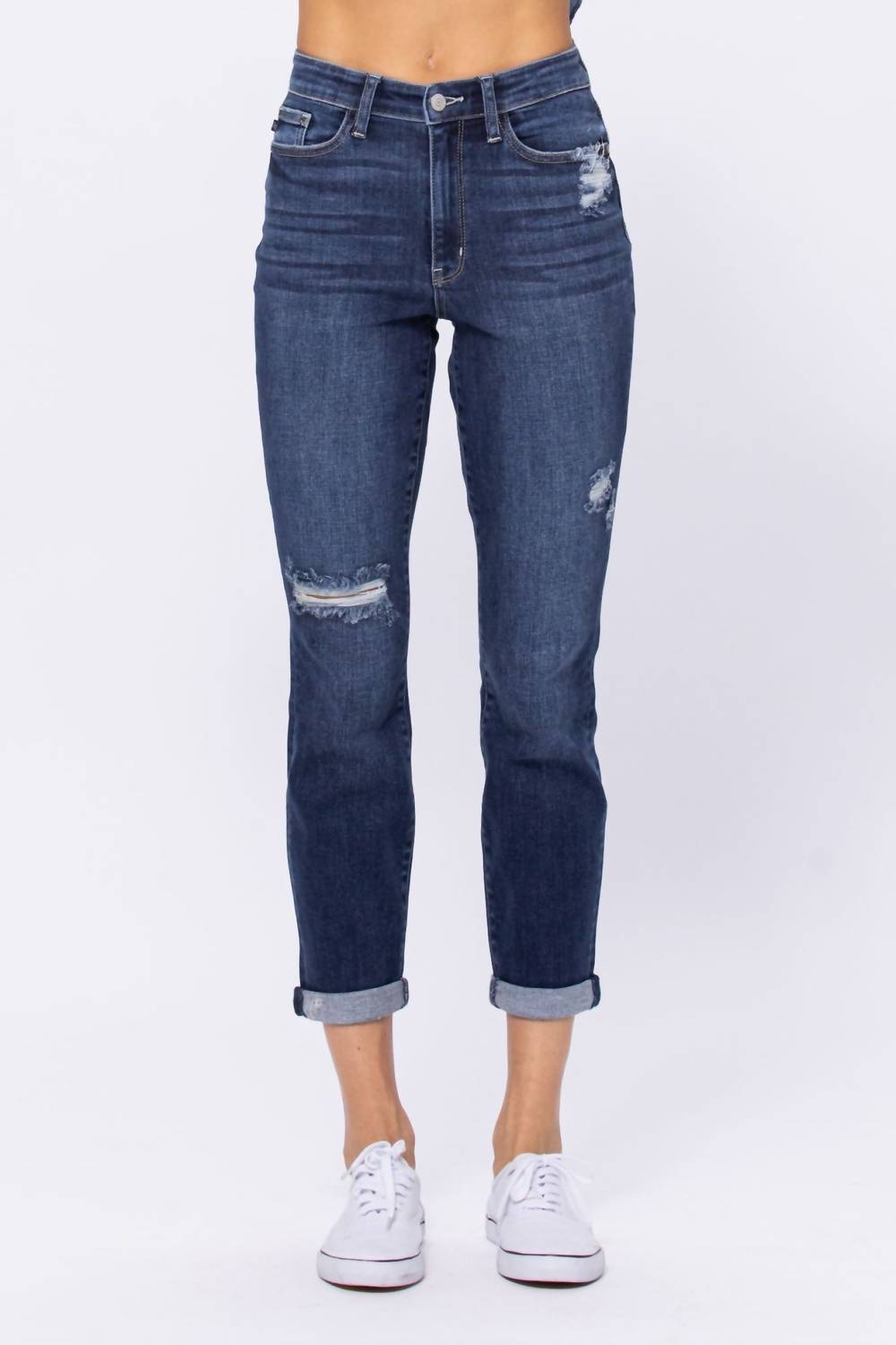 Essas calças jeans boyfriend fazem com que qualquer peça que você combine com elas pareça descolada e sem esforço. Eleve sua coleção de jeans com a Calça Jeans Boyfriend Destroyed de Cintura Alta Azul Judy, em uma elegante Lavagem Escura. Com cintura alta e corte slim com pernas retas, esta calça jeans é confeccionada em uma confortável mistura de algodão com 93% algodão, 6% poliéster e 1% elastano. Desfrute da flexibilidade de uma bainha com 68 cm e uma costura interna sem bainha de 74 cm, com bolsos práticos e fecho de botão para maior segurança. Com uma referência estilosa às tendências dos anos 90, esta calça jeans é perfeita para um festival de música e pode ser lavada na máquina para facilitar a manutenção.