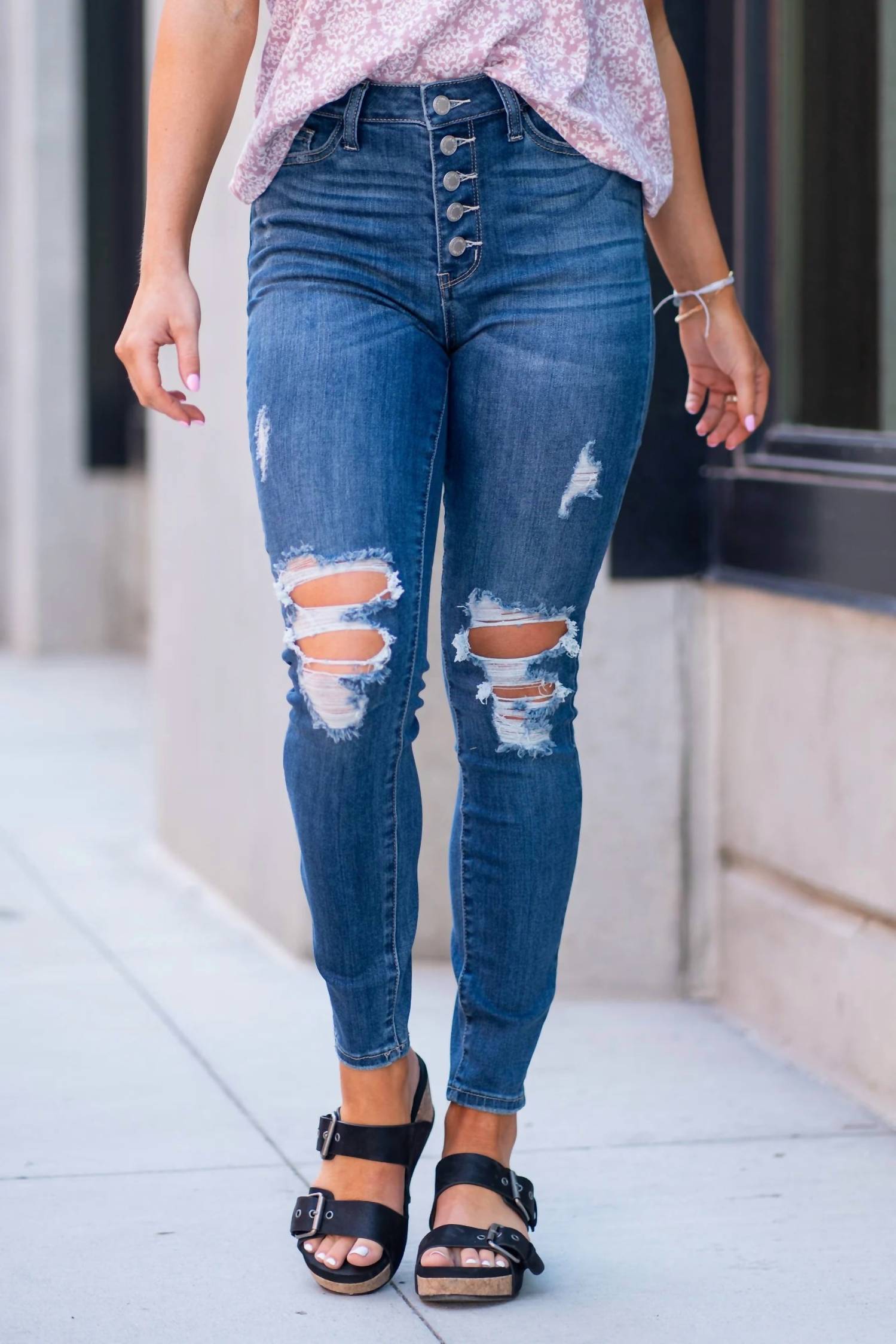 Conheça a Calça Jeans Skinny Desgastada Judy Blue de Cintura Alta com Braguilha e Botões, sua companheira jeans perfeita para o outono, com uma lavagem escura moderna. Esta calça jeans de cintura alta apresenta fecho de botão e joelhos desgastados para um visual ousado, enquanto o tecido elástico garante conforto e um caimento justo. Confeccionada em 66% algodão, 21% poliéster, 11% rayon e 2% elastano, possui costura interna de 71 cm e oferece versatilidade para combinar com qualquer blusa. O cuidado é simples, com instruções de lavagem a frio e secagem no varal. Observe que os tamanhos variam de 0/24 com 25 cm de altura a 60 cm de altura com 33 cm, garantindo um ajuste para diferentes tamanhos.