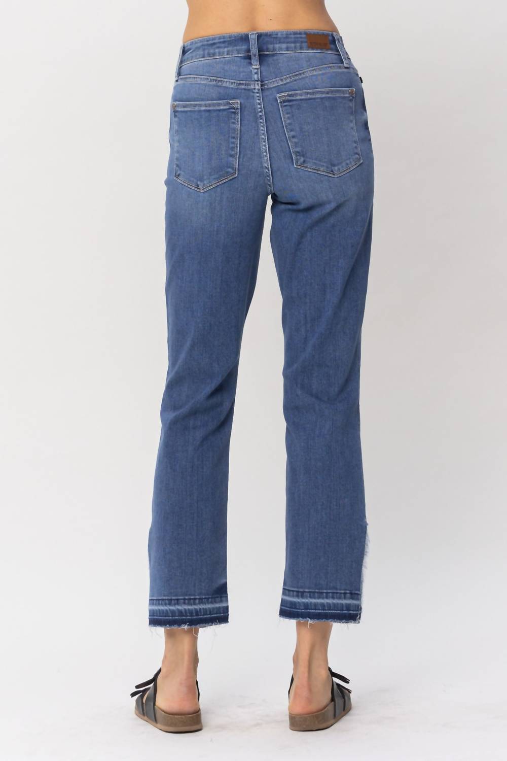A Calça Jeans Reta com Cintura Alta e Fenda Desfiada da Judy Blue foi desenvolvida para proporcionar conforto e estilo. Confeccionada em uma mistura de 66% algodão, 21% poliéster, 11% rayon e 2% elastano, esta calça jeans apresenta cintura alta com 26 cm de altura frontal e costura interna de 71 cm. O fecho de botão garante um ajuste seguro, enquanto a lavagem média confere um visual sólido e versátil. Para manter a qualidade, vire do avesso e lave em água fria, secando ao ar livre ou em temperatura baixa. A modelo veste tamanho 1 (altura de 1,75 m, cintura de 61 cm, quadril de 86 cm).