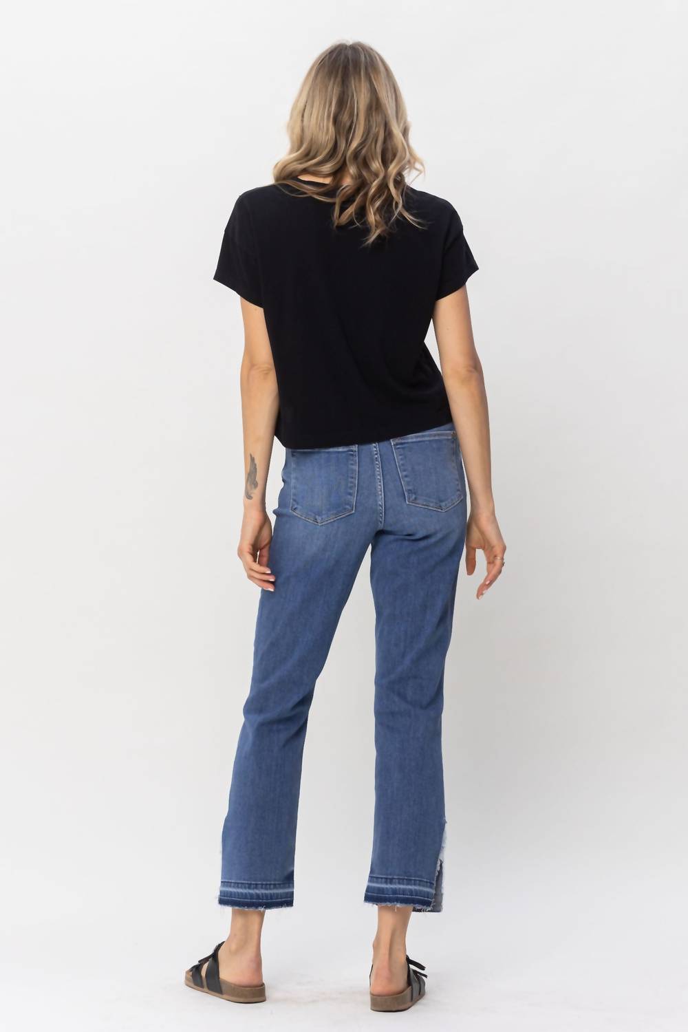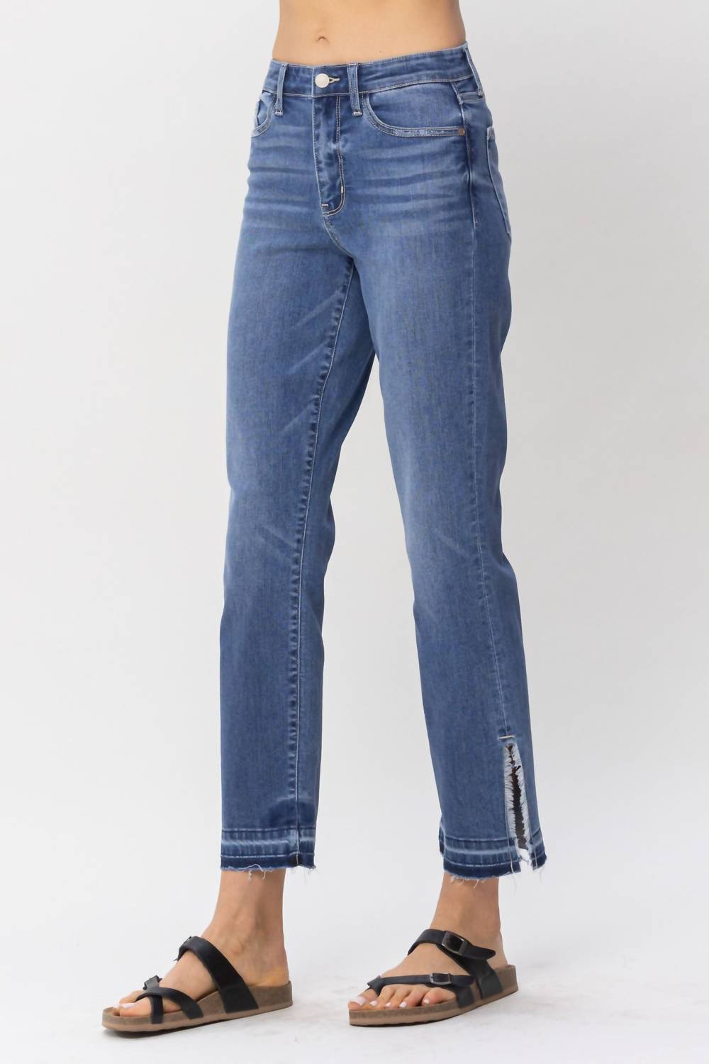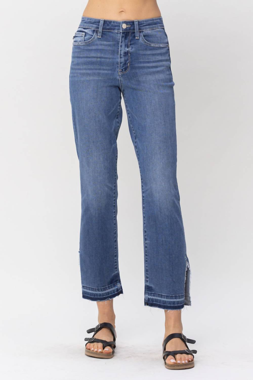 Esses jeans indispensáveis têm um caimento perfeito. A Calça Jeans Reta com Cintura Alta e Fenda Desfiada da Judy Blue foi desenvolvida para proporcionar conforto e estilo. Confeccionada em uma mistura de 66% algodão, 21% poliéster, 11% rayon e 2% elastano, esta calça jeans apresenta cintura alta com 26 cm de altura frontal e costura interna de 71 cm. O fecho de botão garante um ajuste seguro, enquanto a lavagem média confere um visual sólido e versátil. Para manter a qualidade, vire do avesso e lave em água fria, secando ao ar livre ou em temperatura baixa. A modelo veste tamanho 1 (altura de 1,75 m, cintura de 61 cm, quadril de 86 cm).