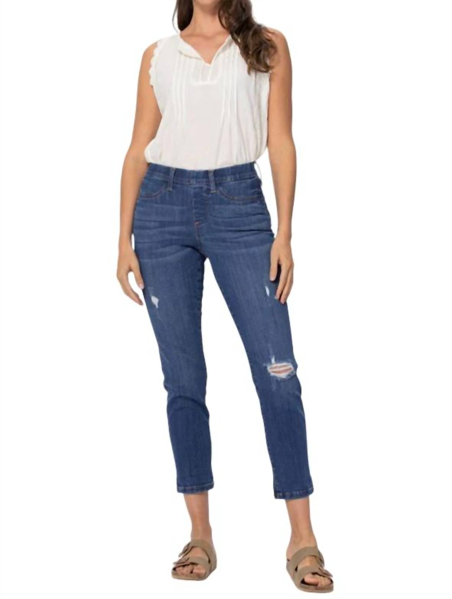 A Jegging Mid Rise Destroyed combina um corte boyfriend com cintura alta para um visual descontraído e estiloso. Esta jegging azul-escuro apresenta detalhes modernos em destroyed e um design prático com quatro bolsos. Confeccionada em uma mistura confortável de 52,2% algodão, 21,5% rayon, 23,4% poliéster e 2,9% Lycra, oferece elasticidade e respirabilidade. A costura interna mede 68 cm com punho e 73 cm sem punho, enquanto o cós tem 24 cm, tornando-a uma peça versátil para qualquer guarda-roupa. As instruções de cuidado recomendam lavar na máquina em água fria.