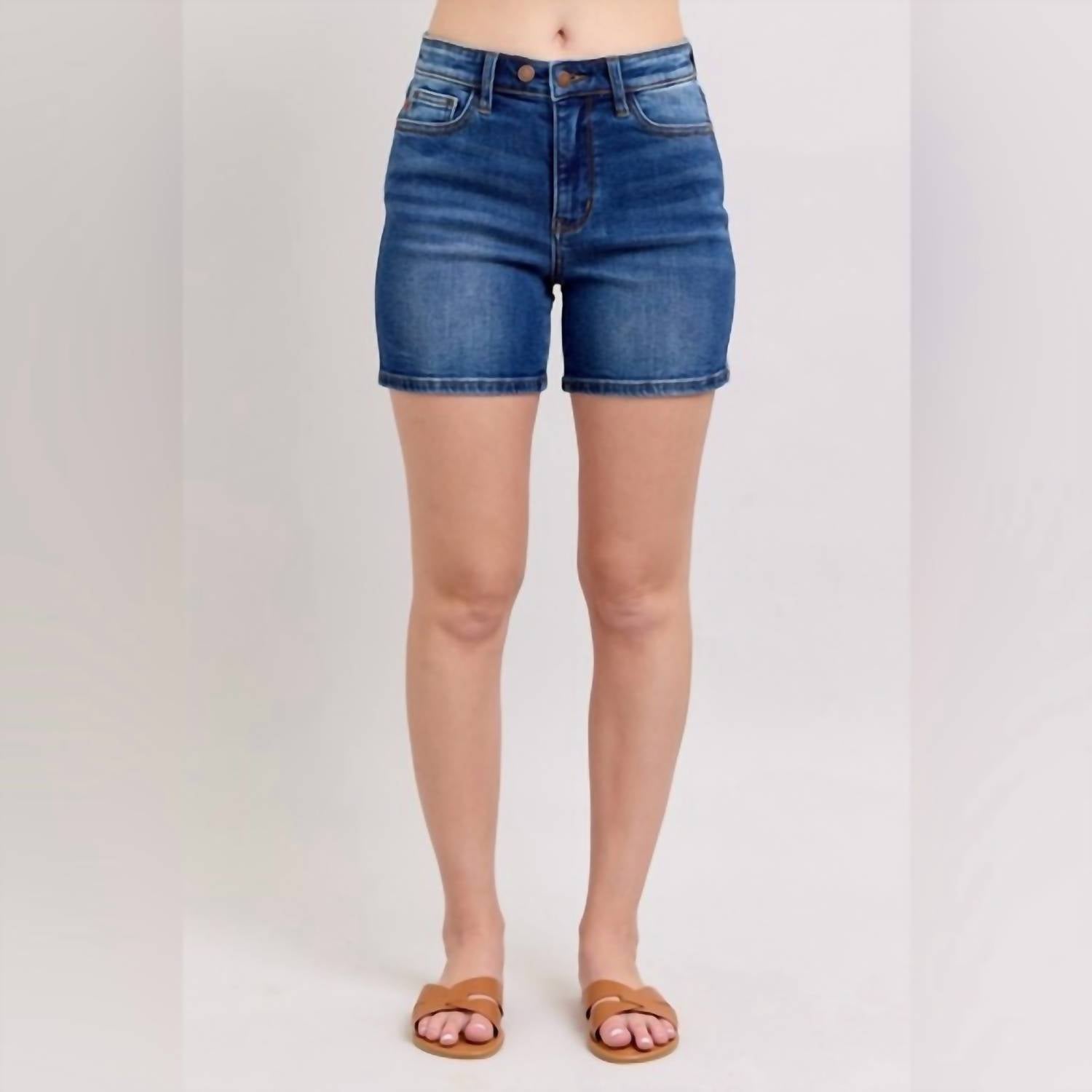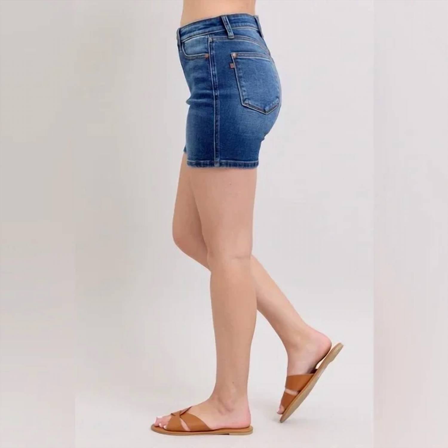 Jean shorts so versatile, you can literally wear them with anything. Introducing the Penny 2 Button Mid Length Dad Denim Shorts by Judy Blue, perfect for a modern minimalist look with a touch of holiday charm. These women's jean shorts feature a dark wash and a solid pattern with a rise of 10 1/4" and an inseam of 5.25", offering a relaxed yet stylish silhouette. Crafted from a cotton blend material composed of 93% Cotton, 6% Polyester, and 1% Spandex for ultimate comfort. Closure: Button closure. Care: Machine wash and tumble dry. Perfect for a Spring holiday party or 4th of July celebration.