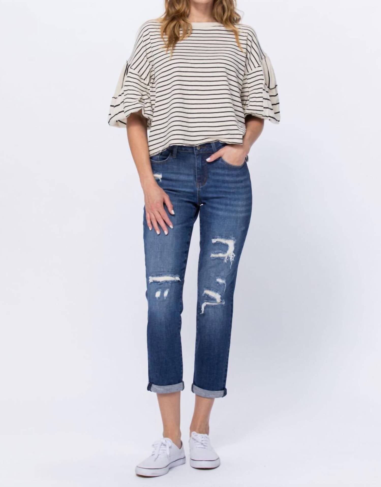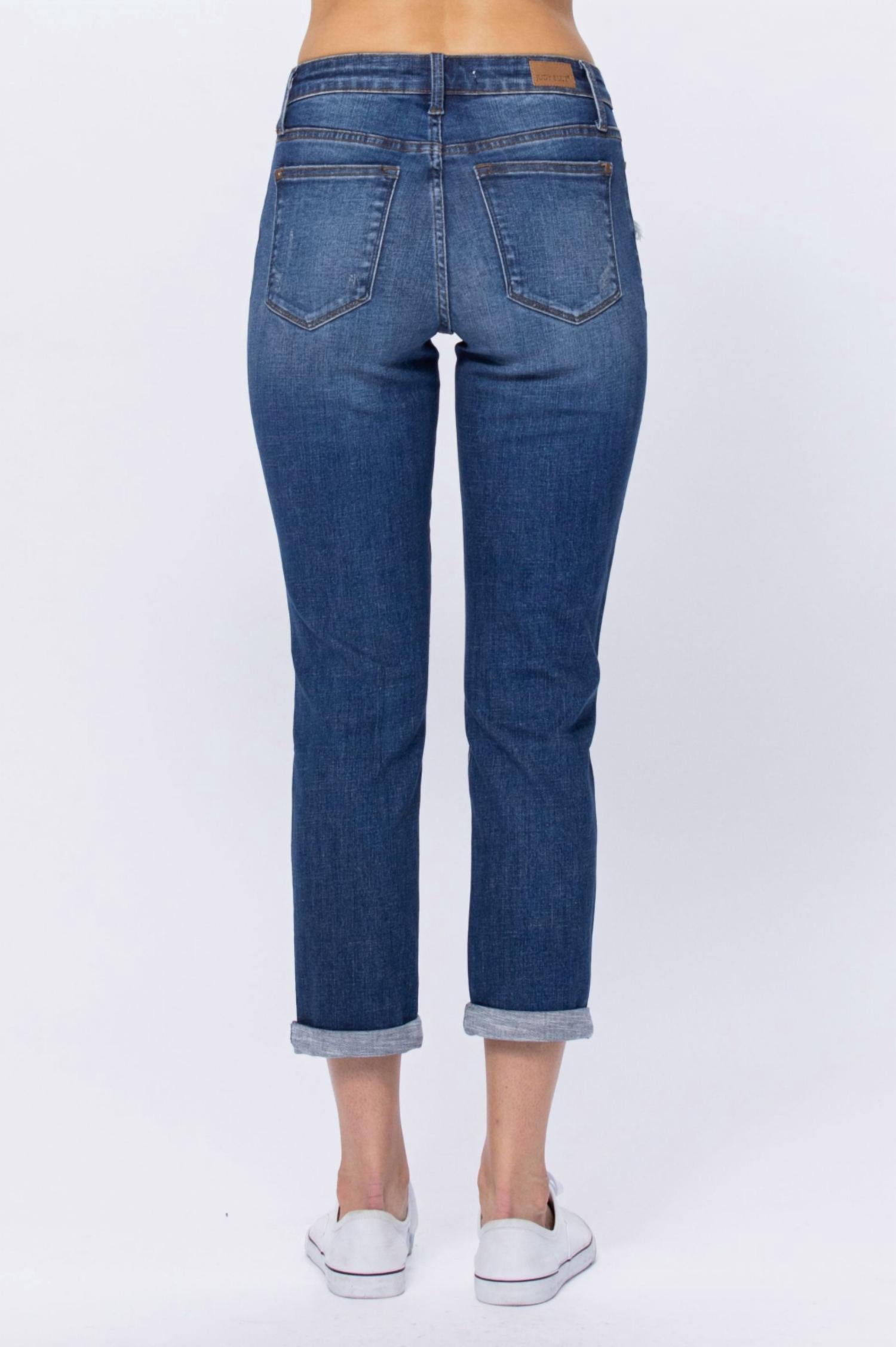Essas calças jeans boyfriend fazem com que qualquer peça que você combine com elas pareça descolada e sem esforço. Atualize sua coleção de jeans com a Calça Jeans Judy Blue Thermal Patch Boyfriend, em um versátil azul com lavagem média. Confeccionada em 91% algodão, 7% poliéster e 1% elastano, esta calça promete conforto e um caimento impecável. Com cós médio de 24 cm, oferece comprimento ajustável com opções de 68 cm com punho duplo e 73 cm sem punho. O fechamento é simples com zíper, e o padrão sólido e os bolsos práticos a tornam uma escolha clássica para o dia a dia.