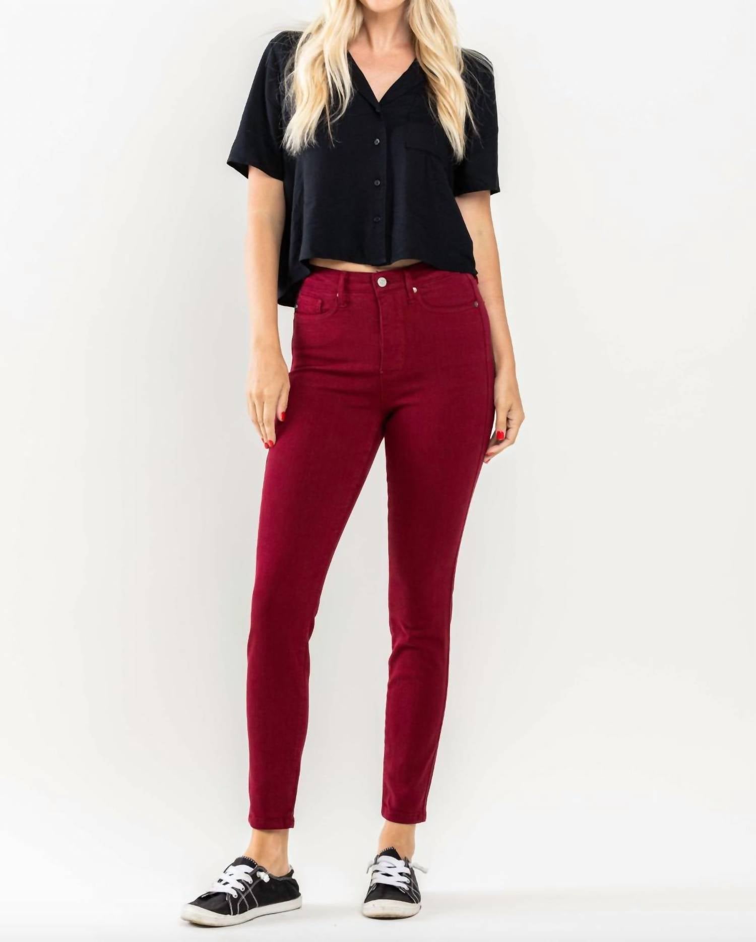 Conheça a Calça Jeans Skinny Judy Blue Tummy Control na cor Scarlet, feita sob medida para quem está sempre antenado na moda. Com cintura alta de 28 cm e pernas skinny e elegantes, esta calça jeans conta com fecho de zíper para um visual impecável. Confeccionada em uma confortável mistura de algodão com 93% algodão, 6% poliéster e 1% elastano, ela promete estilo e elasticidade. Observe que esta calça jeans é um pouco justa, então considere escolher um tamanho maior do que o seu tamanho habitual Judy Blue para um melhor ajuste. A costura interna mede 73 cm.