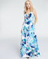 | Aproximadamente 48 de comprimento, do centro das costas abertas até a bainha. O comprimento varia 1/4 entre os tamanhos. | Decote em V profundo; corte estilo vestido de baile. | Fecho duplo de colchete na parte de trás do pescoço; zíper oculto na cintura. | Costas recortadas; bojos de sutiã; fenda na saia envelope falsa. | Forrado.