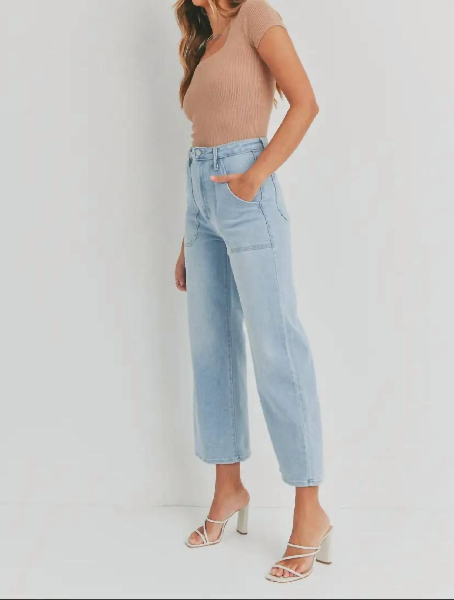Discover the Cargo Pocket Wide Leg High Rise Jeans by JUST BLACK DENIM in a trendy light wash, engineered for both comfort and style. These jeans feature a high rise of 12 inches and a relaxed fit, perfectly contoured with a zip closure for ease. Crafted from a blend of 93% Cotton, 5% Polyester, and 2% Spandex, they include functional utility cargo pockets for a practical yet fashionable touch. Made in the USA, these jeans are easy to care for with machine wash and tumble dry instructions, perfect for any casual occasion.