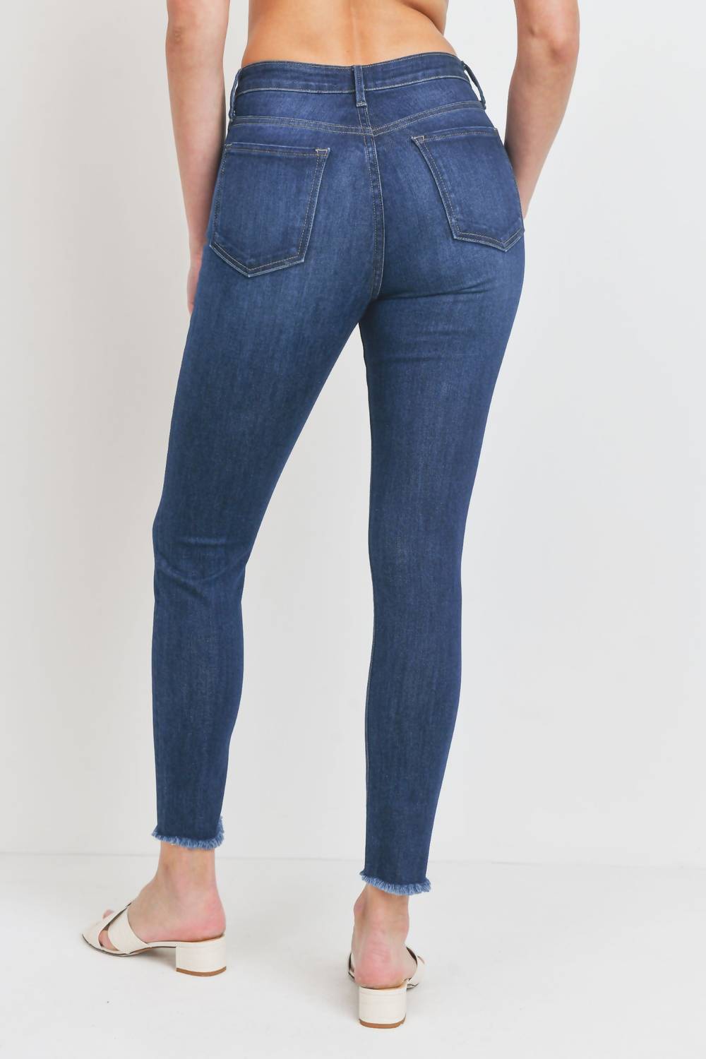 Todo mundo precisa de uma boa calça jeans skinny, e este é um modelo que você vai querer usar em qualquer estação. Modelo com 5 bolsos. Fechamento por zíper e botão. Calça jeans skinny. Jeans escuro premium. Detalhe moderno de desfiado. Jeans com elastano para uma silhueta elegante. 100% algodão. Lavagem à máquina com água fria.