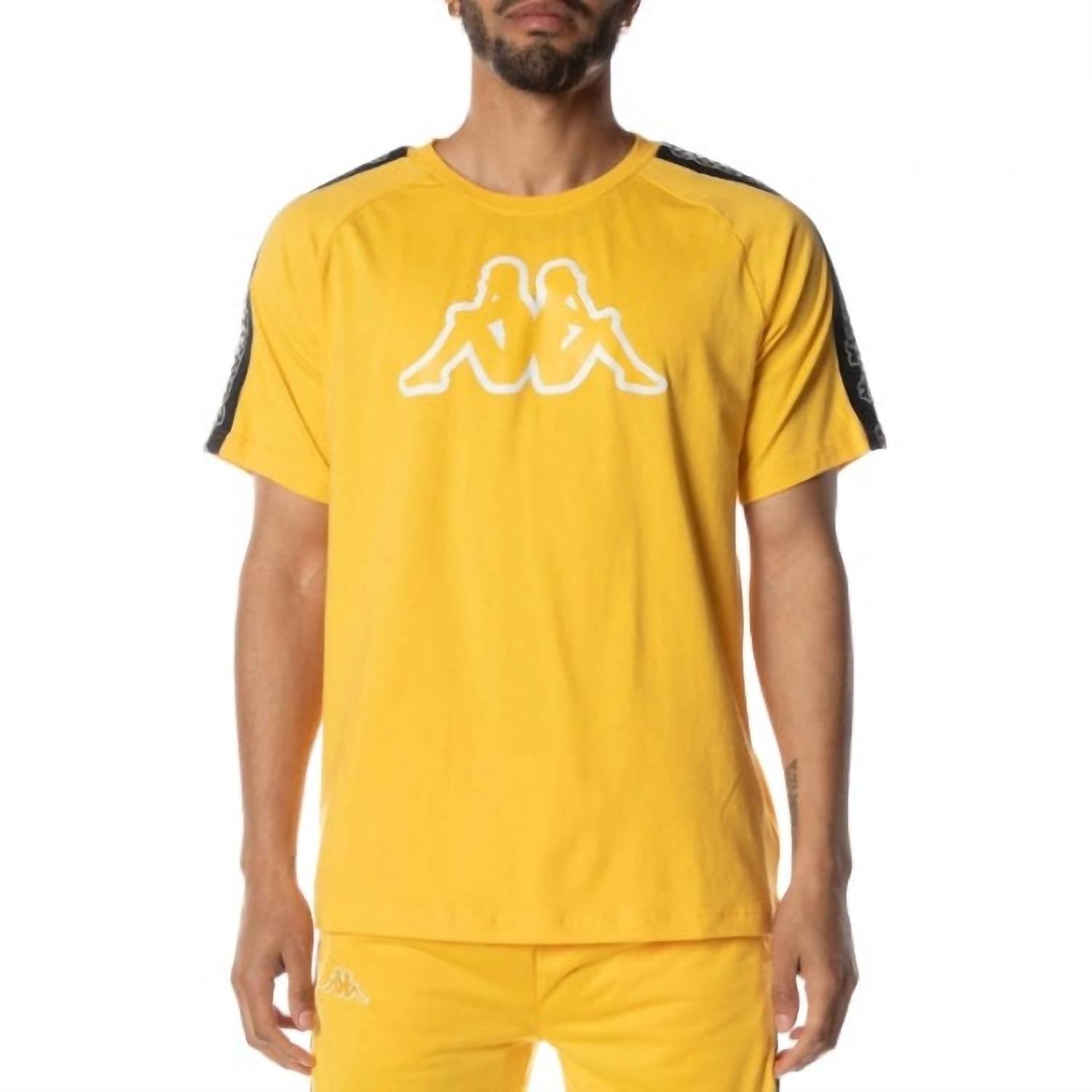 Introducing the Kappa Logo Tape Davirec Tee Shirt, designed for men with a streetwear-inspired style. This activewear t-shirt features short sleeves and a classic crewneck, crafted from 100% cotton for ultimate comfort. Highlighting the brand's identity, the tee includes logo tape on the sleeves and the iconic Omini logo printed on the chest. With a pull-on closure, it's an ideal choice for summer vacations with a striking yellow, grey, and black colorway.