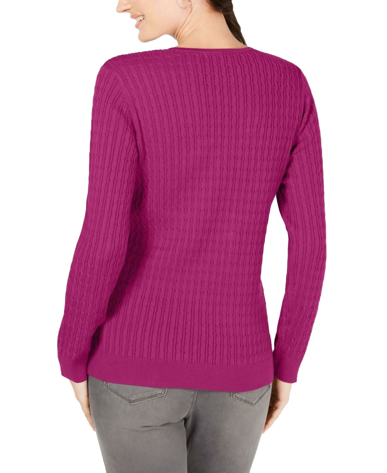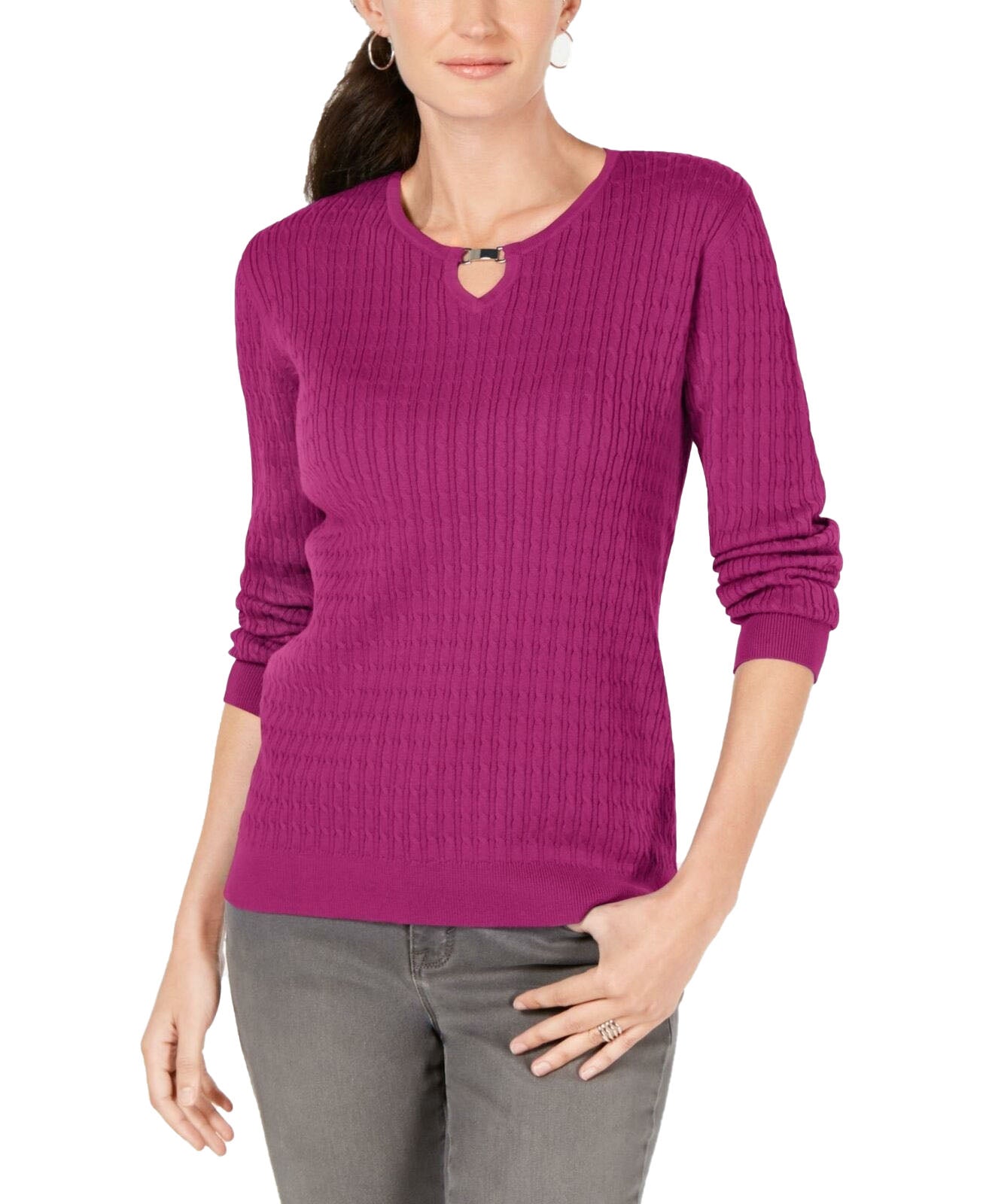 Comprimento no quadril; aprox. 60 cm | Devido ao tamanho generoso, sugerimos um tamanho menor para um ajuste perfeito | Decote redondo | Malha trançada; recorte em formato de fechadura com detalhes de ferragens no decote | Todo em algodão | Lavável à máquina | Importado