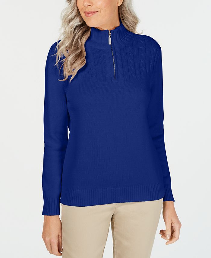 100% algodão | 100% sem esforço; o pulôver pequeno e prático da Karen Scott é a peça ideal para se manter aquecido em escritórios frios no verão ou em dias frios no outono. | Ajuste fácil; fica no quadril; aprox. 24 de comprimento | Devido ao tamanho generoso | sugerimos um tamanho menor para um ajuste perfeito | Projetado para se ajustar e valorizar pessoas de 1,62 m ou menos | Gola alta simulada; fecho de zíper de um quarto