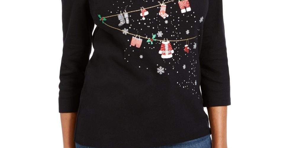 Karen Scott Top de algodão com detalhes femininos, preto, tamanho pequeno e pequeno
