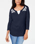 Ajuste relaxado; comprimento no quadril; aprox. 66 cm de comprimento | Devido ao tamanho generoso, sugerimos um tamanho menor para um ajuste perfeito | Decote redondo com fenda e detalhe contrastante | Bordado floral na parte frontal do jugo; bainha arredondada | Mangas 3/4