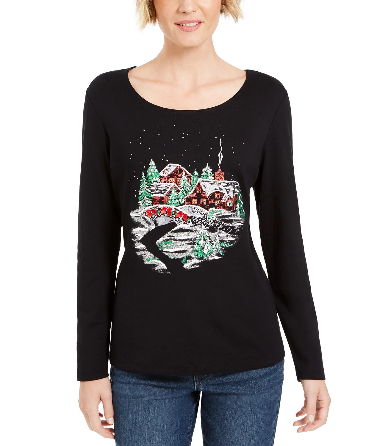 Camisa feminina Karen Scott com estampa de glitter para festas, preta, tamanho médio