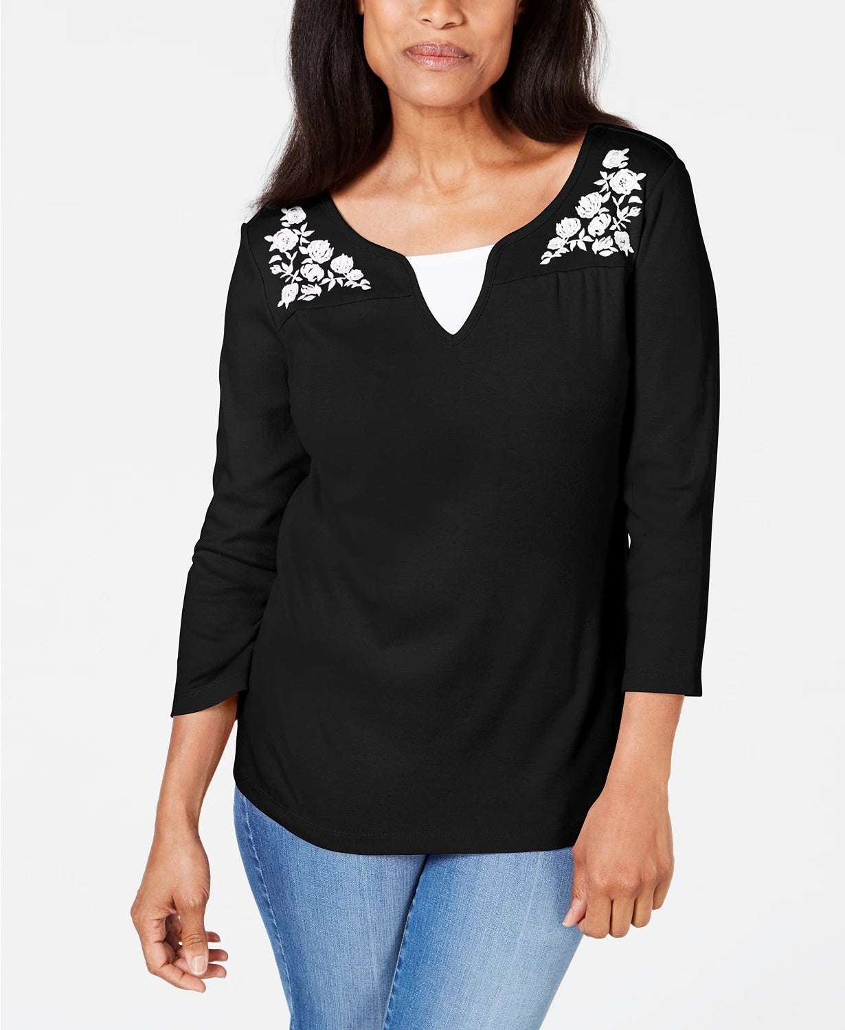 Comprimento aproximado: 24" | Projetado para se ajustar e valorizar pessoas de 1,62 m ou menos | Decote redondo com fenda e detalhe contrastante | Bordado floral na pala frontal; visual em camadas | Mangas 3/4