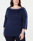 Ajuste relaxado; atinge o quadril; aprox. 71 cm de comprimento a partir do centro da gola traseira | Decote canoa | Listra contrastante com tachas no decote, mangas | Mangas 3/4