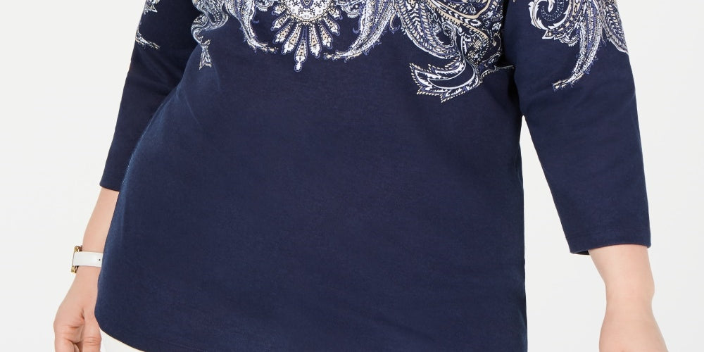 Ajuste relaxado; atinge os quadris; aprox. 28 de comprimento | Decote canoa | Mangas 3/4 | Algodão/poliéster