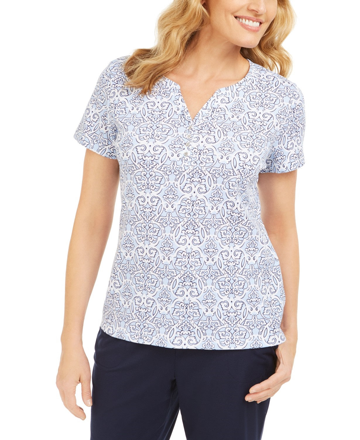 Karen Scott Blusa Henley Feminina Estampada Manga Curta Azul Brilhante Tamanho P