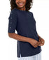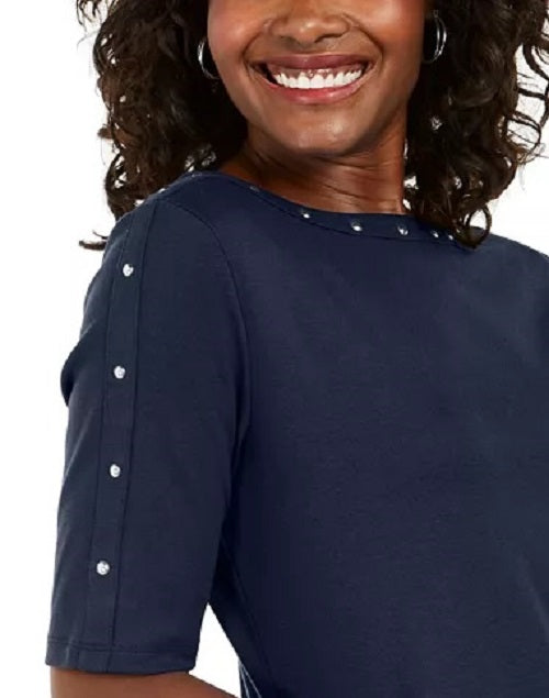 Karen Scott Blusa Feminina com Tachas, Manga Cotovelo e Gola Canoa, Azul Escuro, Tamanho P