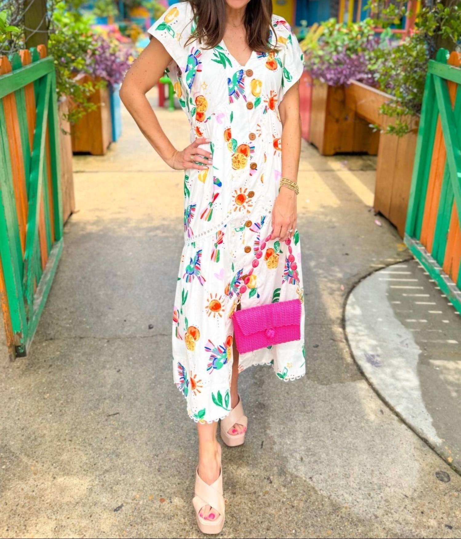 Basta adicionar slides ou mules e pronto. Apresentamos o Vestido Longo Toucan da Karlie, uma adição deslumbrante a qualquer conjunto para jantar. Este modelo em corte A apresenta decote em V e mangas curtas, confeccionado em um design com estampa vibrante que captura a elegância do verão sem esforço. O vestido tem um comprimento midi elegante em um tom branco clássico. Fechamento: Botão. Perfeito para mulheres que apreciam sofisticação elegante sem complicações.