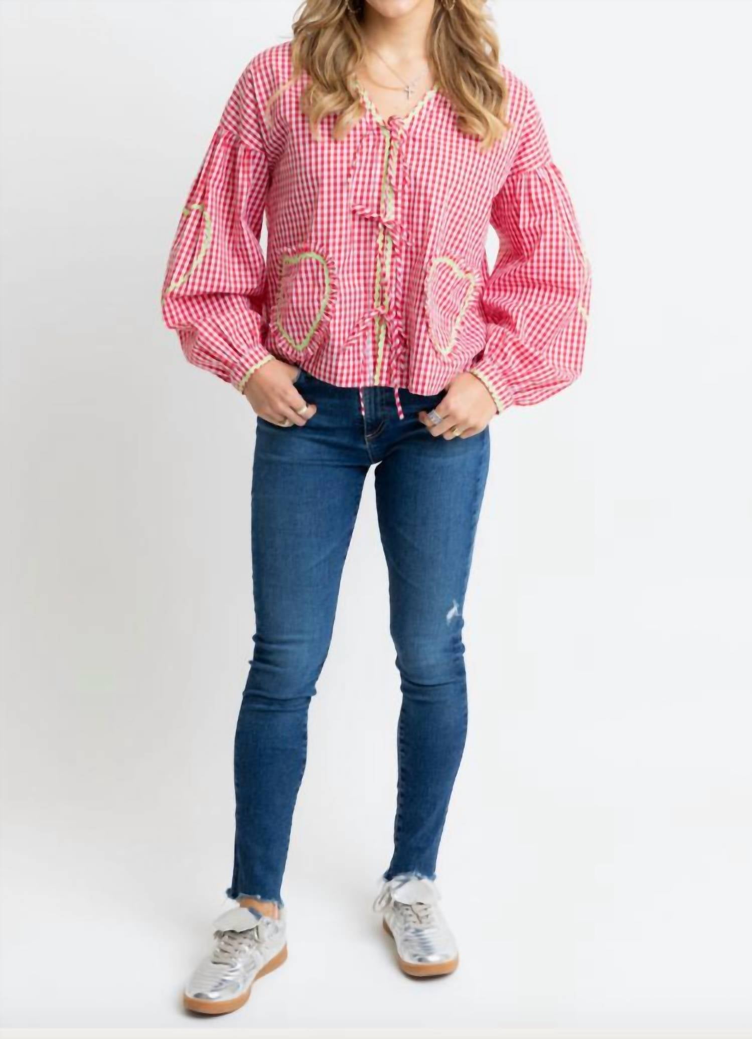 A versatile blouse that works from desk to dinner! Elevate your style with the Karlie Vintage Check Ric Rac Heart Tie Top, designed in a striking red plaid and check pattern. This blouse features long sleeves, crafted from comfortable cotton, and adorned with a chic ricrac heart detail, adding a unique touch to your holiday party ensemble. It comes with a V-neckline and a convenient tie closure, perfect for both casual and elevated looks. A versatile wardrobe essential, this season's must-have merges the charm of vintage trends with modern flair.