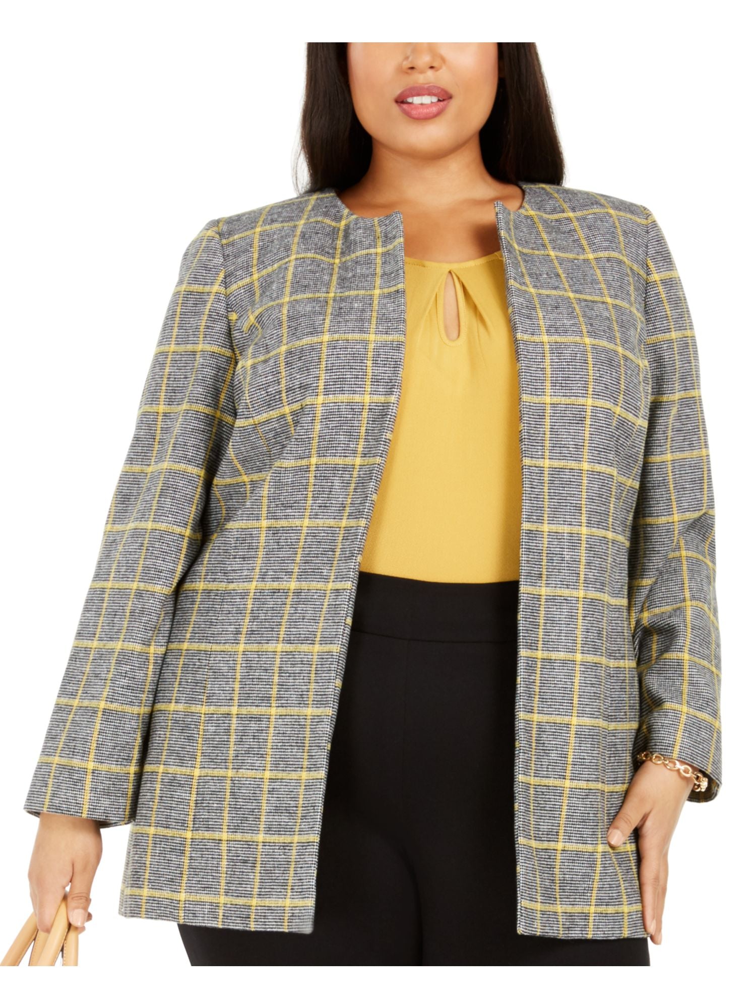 Jaqueta xadrez feminina Kasper Plus com frente aberta, amarela, tamanho 14W