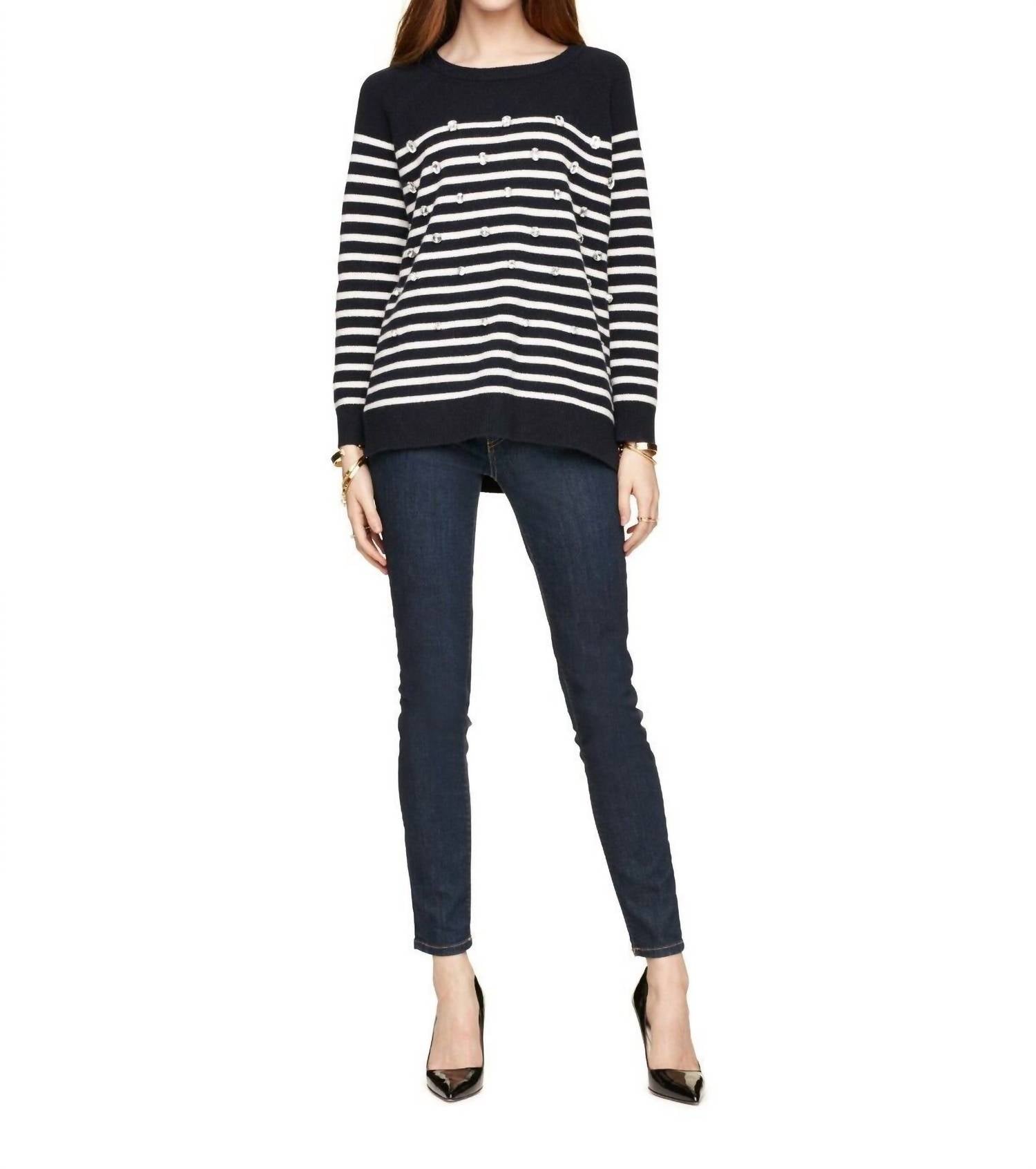 Eleve seu guarda-roupa de fim de semana com o suéter Kate Spade de lã merino listrada com cristais. Este suéter estiloso possui mangas compridas e é confeccionado em 100% lã merino extrafina, oferecendo conforto e aconchego, além de um caimento elegante e descontraído. A peça mede de 63,5 cm a 66,5 cm de comprimento, com ombros de 52,5 cm, peito de 49,5 cm e mangas de 44,5 cm. O design de gola redonda apresenta listras azul-marinho e creme adornadas com cristais brilhantes, adicionando um toque de glamour. Originário de um país não revelado, o suéter possui gola, punhos canelados, bainha lateral dividida e fecho pull-on, perfeito para um estilo despojado. Para cuidados, lave somente a seco.