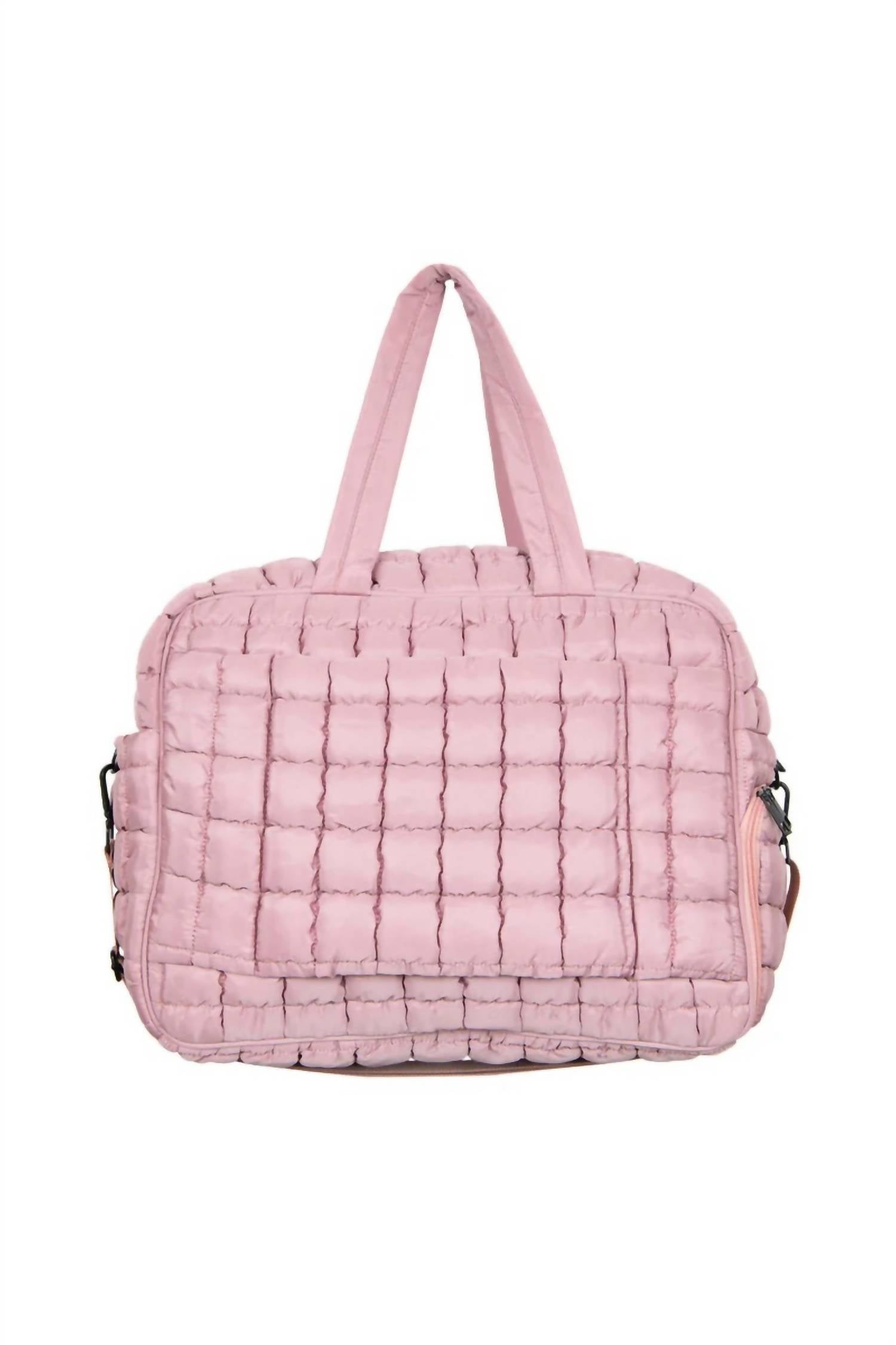 Travel in style with the Katydid Mauve Quilted Garment Duffel Bag, tailored for the modern explorer. This bag features an adjustable crossbody strap extending to 56”, a zipper closure, and convenient dimensions of 19" x 8.5" x 13". Its water-resistant design includes a luggage pass-through sleeve, four interior pockets, two external pockets, a dedicated laptop sleeve, and an exterior hidden shoe compartment. Care for this duffel is simple with machine wash cold and dry flat instructions.