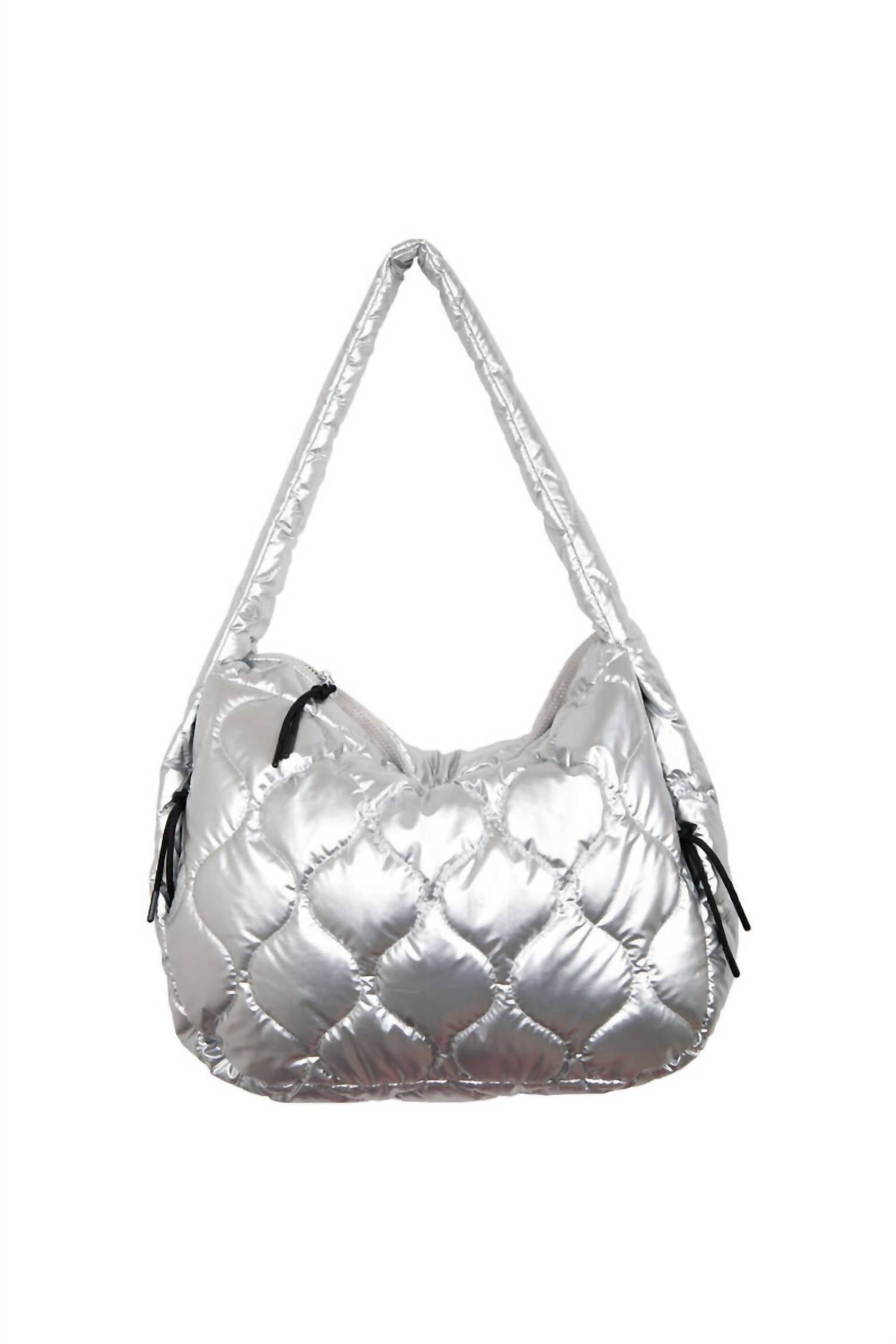Aside from being the cutest bag ever, this tote is the perfect size to hold all of your vacation necessities. Pair this adorable bag with a flowing dress and some slides and you're all set! Upgrade your accessory collection with the Women's Wave Quilted Hobo Tote Bag by Katydid, a chic option in metallic silver that combines fashion with function. The tote features a distinctive wave quilted pattern and a zipper closure for added security. Its spacious 20" x 7" x 15" dimensions include a water-resistant inner lining, two interior pockets, and two convenient exterior side pockets, complemented by a 27" long strap for comfortable carrying. This stylish tote is perfect for those who need a practical yet fashionable way to carry their essentials.