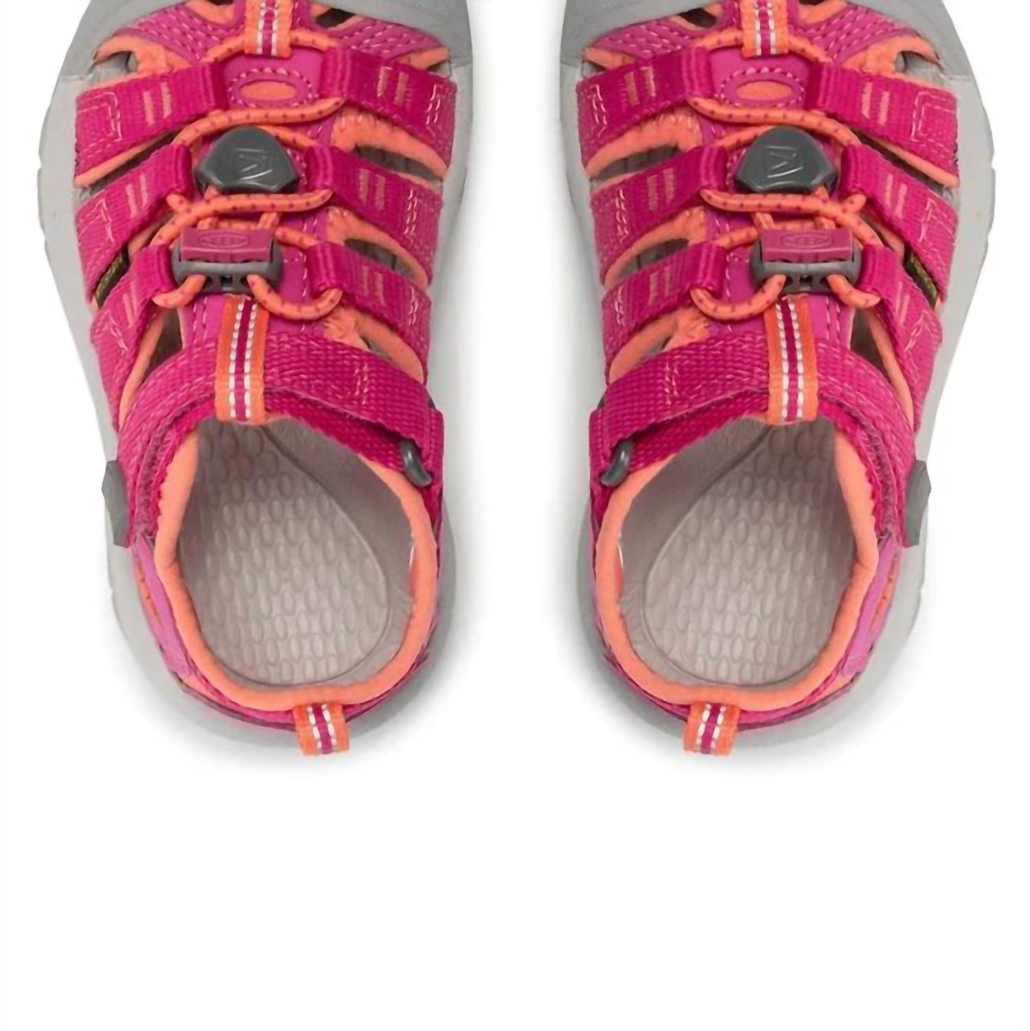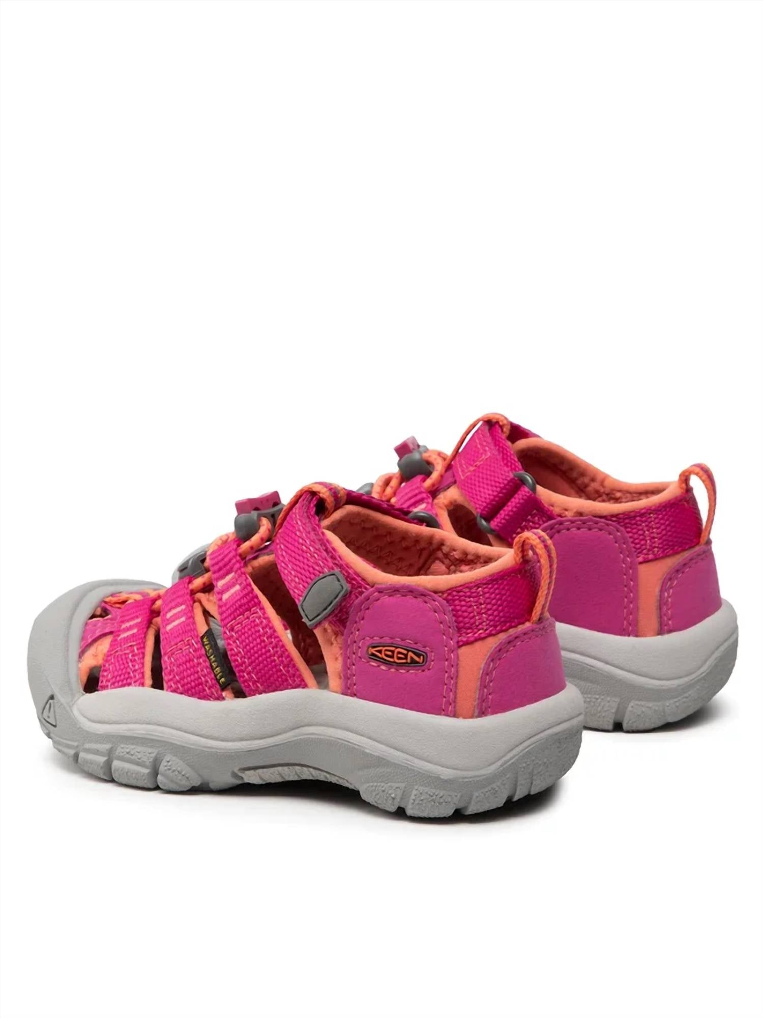 Introducing the Keen Kids Newport H2 Sandals in a vibrant Very Berry hue, designed for adventurous girls. These sandals feature quick-drying washable polyester webbing and a secure fit lace capture system, perfect for water activities. The adjustable hook and loop strap allows for easy wear. Additional features include a hydrophobic mesh lining, metatomical EVA footbed, and a non-marking rubber outsole, ensuring comfort and durability.
