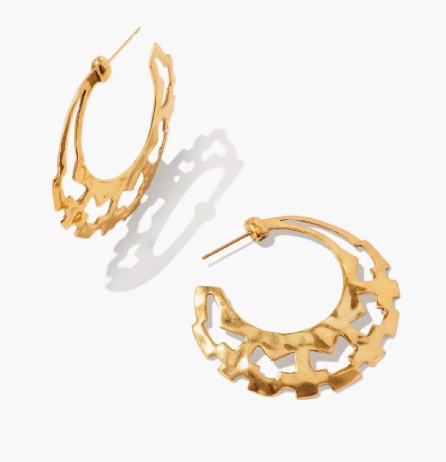 Introducing the Women's Shiva Hoop Earrings by Kendra Scott, a striking interpretation of a timeless design. In a vintage gold hue, these earrings are crafted with intricate cutouts and details that celebrate historical symbolism and motifs. Material: Gold plating. Ideal for fashion-forward individuals seeking a unique accessory.