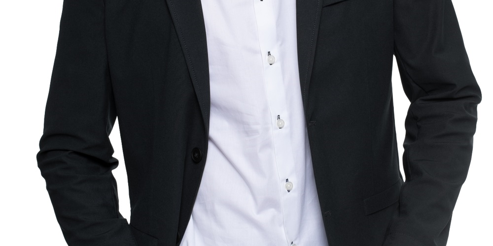 Ajuste regular nos ombros, peito e cintura com cavas e mangas padrão | Lapela entalhada | Fecho de dois botões; punhos de um botão | Dois bolsos frontais embutidos com fechos de zíper ocultos; bolso embutido no lado esquerdo do peito | Abertura central; desempenho elástico | Algodão/elastano