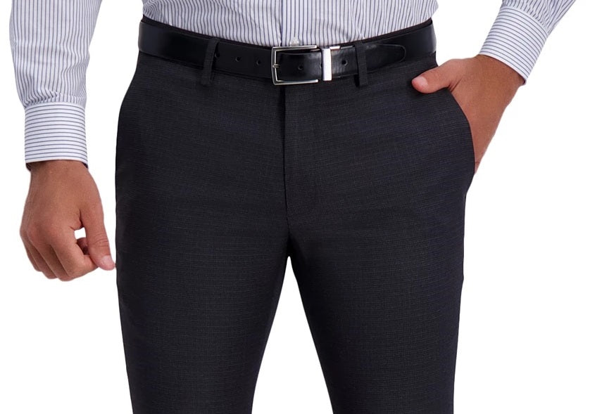 Calça social Kenneth Cole Reaction masculina extra slim fit, com estampa xadrez micro xadrez, cinza escuro, tamanho 34x32
