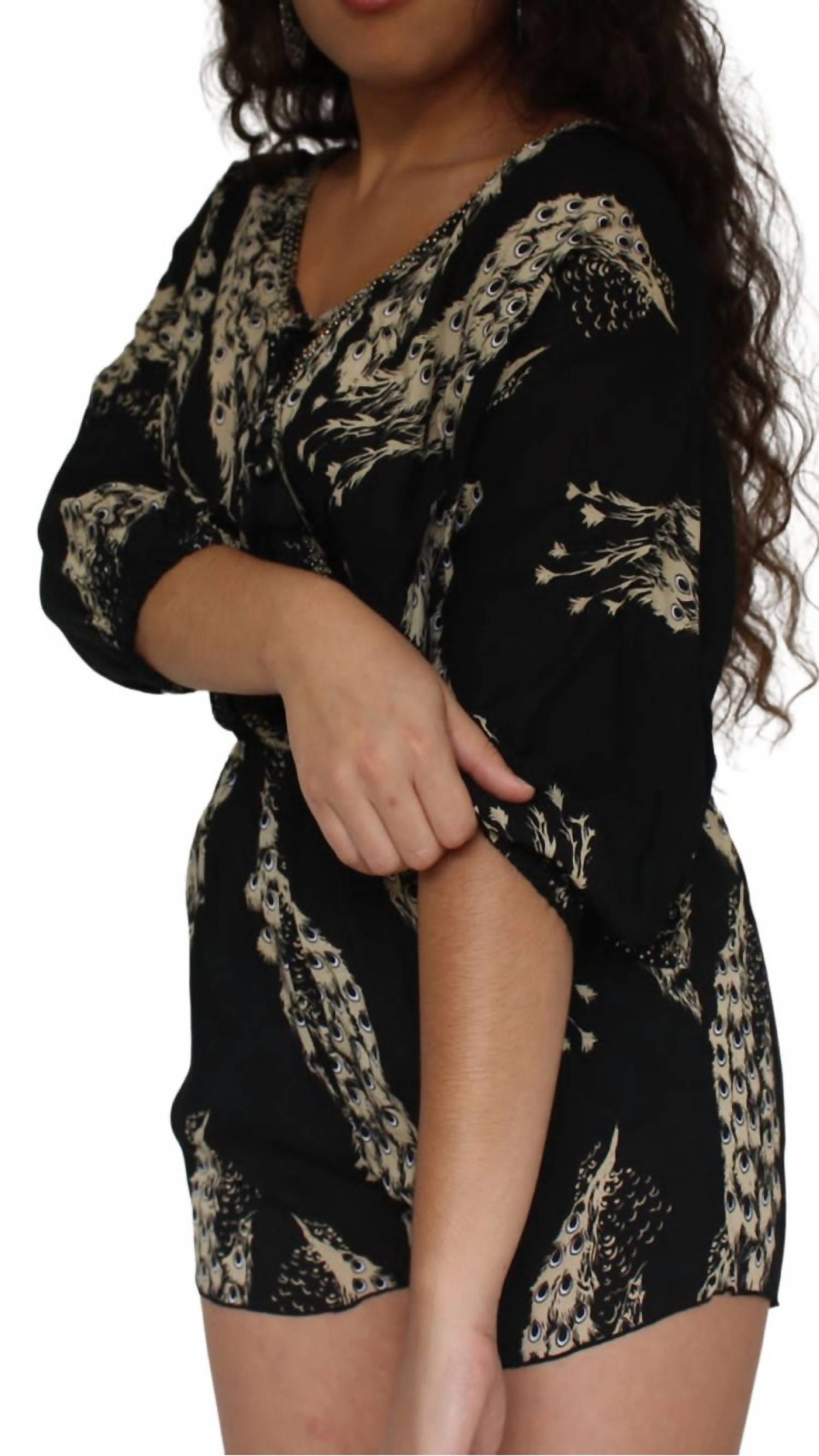 This elegant romper features a high-waisted front wrap design, complemented by elastic puff cuffs, a beaded neckline, and convenient pockets. Crafted from 100% rayon with an elastic waist for comfort. Hand wash in cold water. Made with care in Bali.