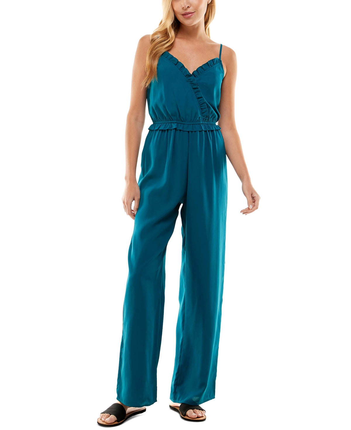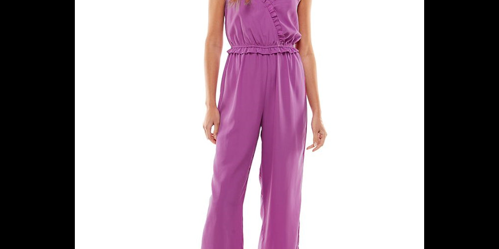 Babados suaves delineiam o formato bufante do macacão de pernas largas da Kingston Grey. Seu corte fluido vai do escritório ao jantar com facilidade. | Costura interna aprox.; 31 | Decote em V sobrepeliz com acabamento franzido | Babados na cintura franzida; design de pernas largas | Alças ajustáveis | PP = 00/0-1/2